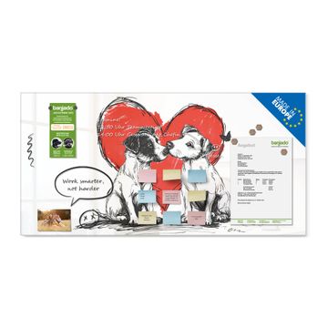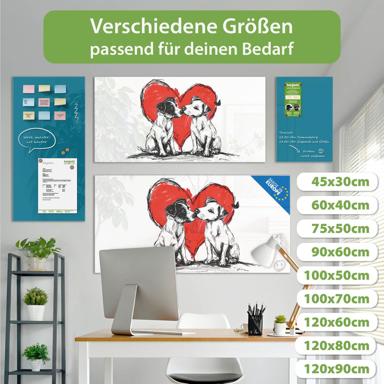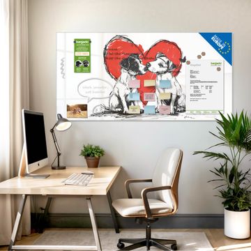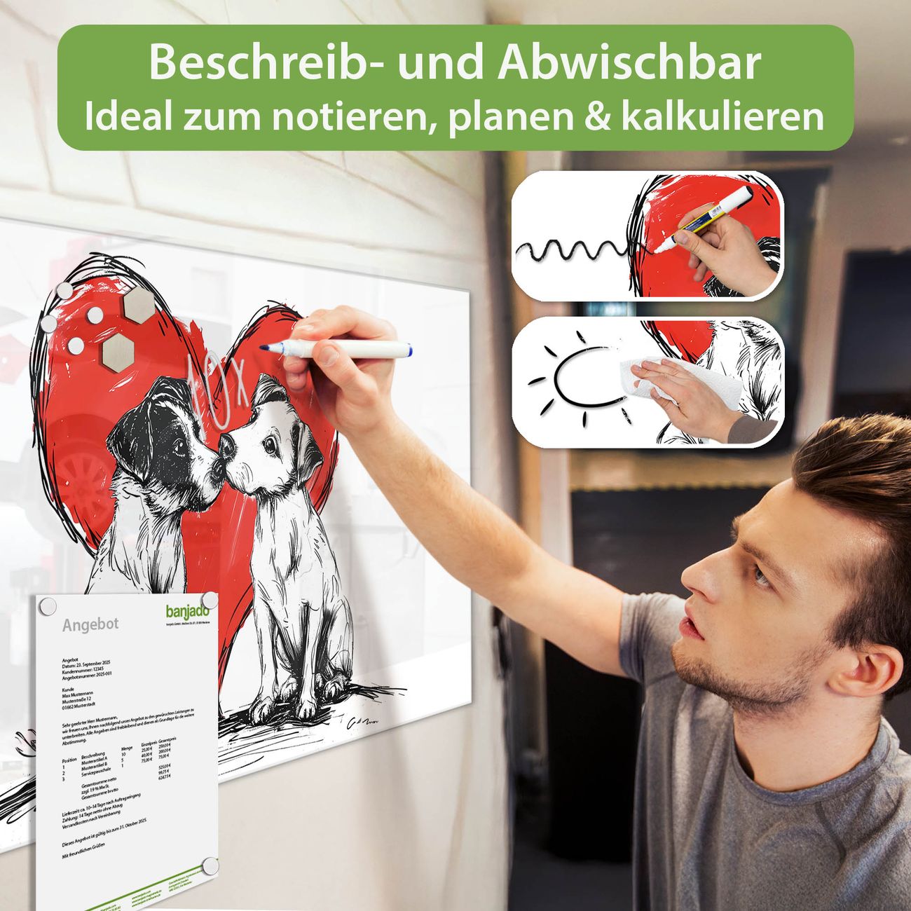 Material: 4mm Sicherheitsglas mit Metallrückwand Eigenschaften: beschreibbar, magnetisch, kratzfest Maße: 100x50x0,6cm, 7,50kg schwer Motiv Nummer 13421 Liebende Hunde Zubehör: inklusive 4 Neodym-Magnete