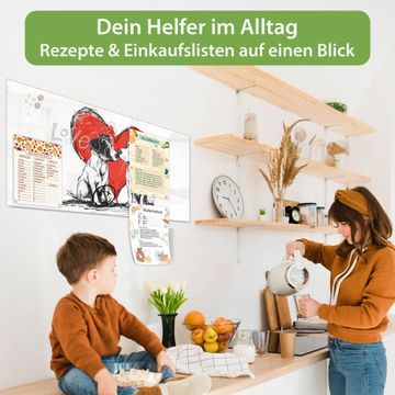 Auf der glatten Glasoberfläche lassen sich Termine, Rezepte oder Notizen ganz einfach mit Kreidestiften festhalten und rückstandslos entfernen. Starke Neodym-Magnete halten Ihre wichtigsten Erinnerungen sicher an Ort und Stelle. So entsteht Ihre ganz persönliche Ideenwand - jeden Tag neu.