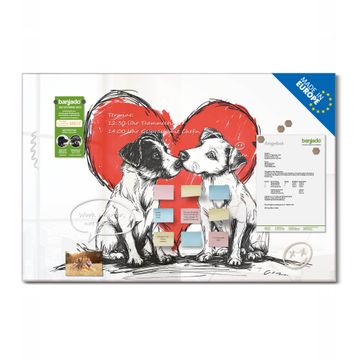 Material: 4mm Sicherheitsglas mit Metallrückwand Eigenschaften: beschreibbar, magnetisch, kratzfest Maße: 120x80x0,6cm, 14,40kg schwer Motiv Nummer 13421 Liebende Hunde Zubehör: inklusive 4 Neodym-Magnete