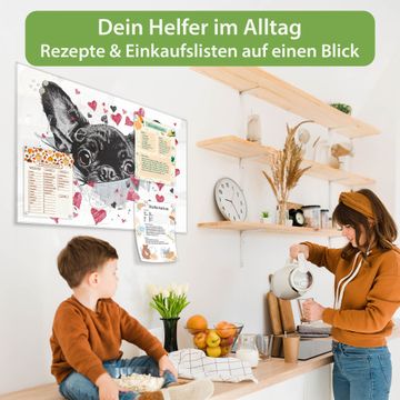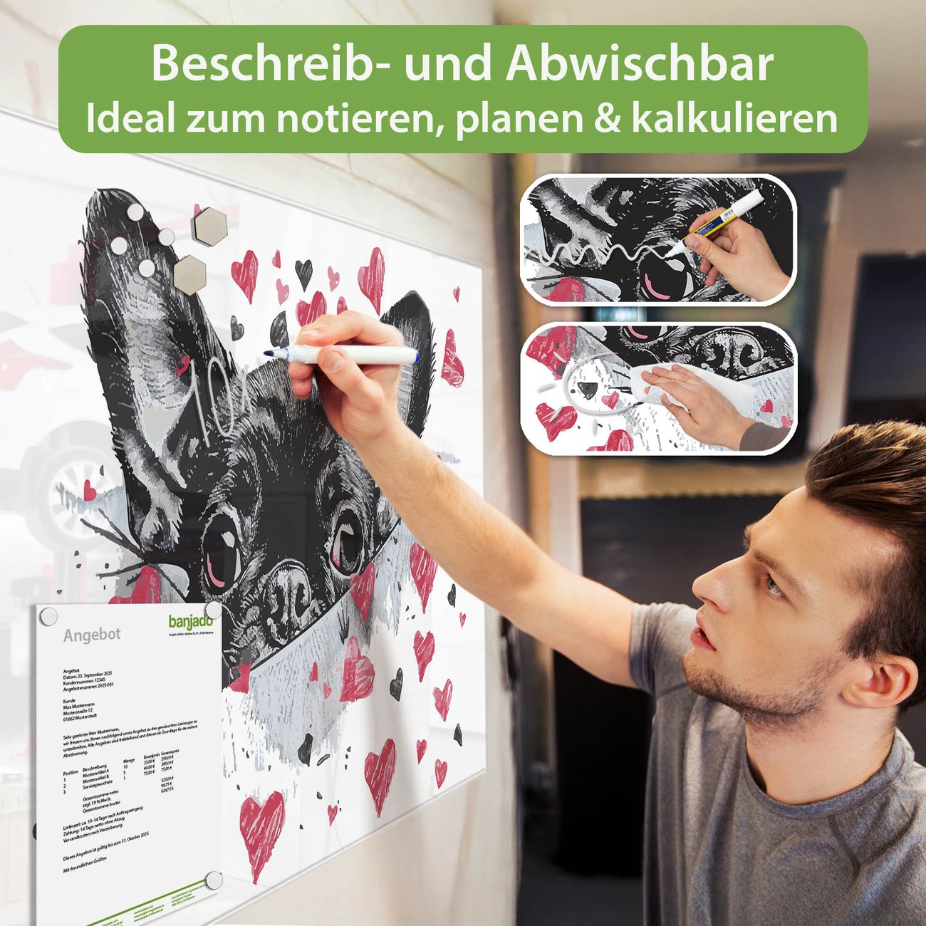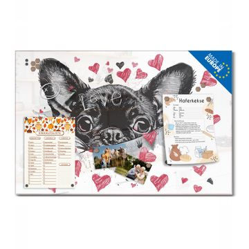 Material: 4mm Sicherheitsglas mit Metallrückwand Eigenschaften: beschreibbar, magnetisch, kratzfest Maße: 75x50x0,6cm, 5,63kg schwer Motiv Nummer 13429 Liebes-Chihuahua Zubehör: inklusive 4 Neodym-Magnete