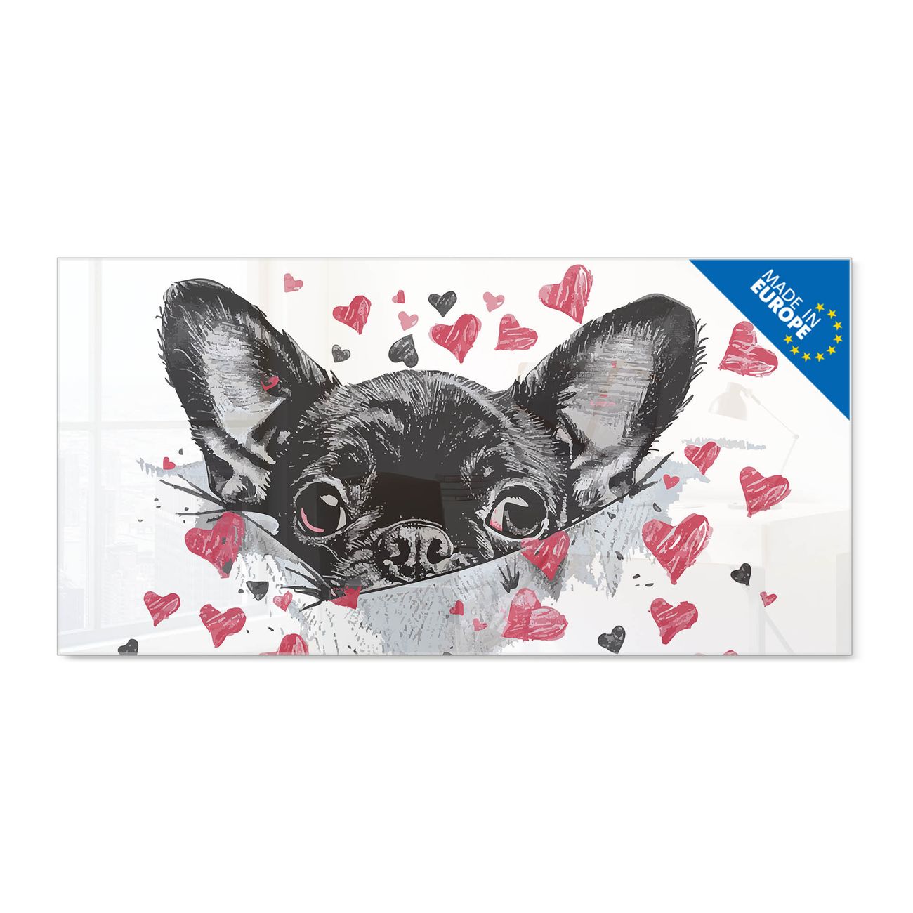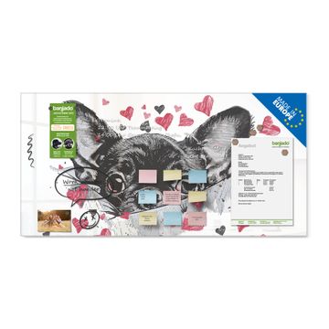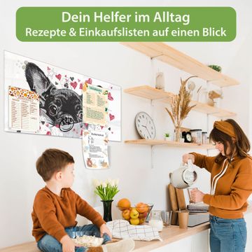 Material: 4mm Sicherheitsglas mit Metallrückwand Eigenschaften: beschreibbar, magnetisch, kratzfest Maße: 100x50x0,6cm, 7,50kg schwer Motiv Nummer 13429 Liebes-Chihuahua Zubehör: inklusive 4 Neodym-Magnete