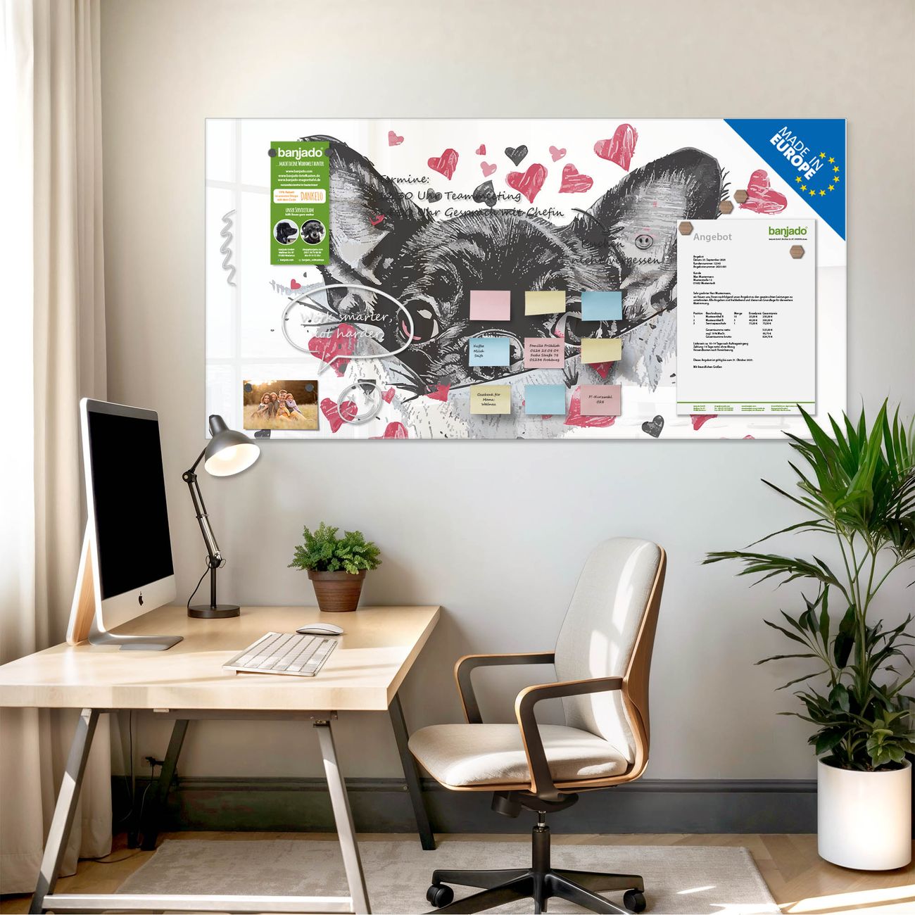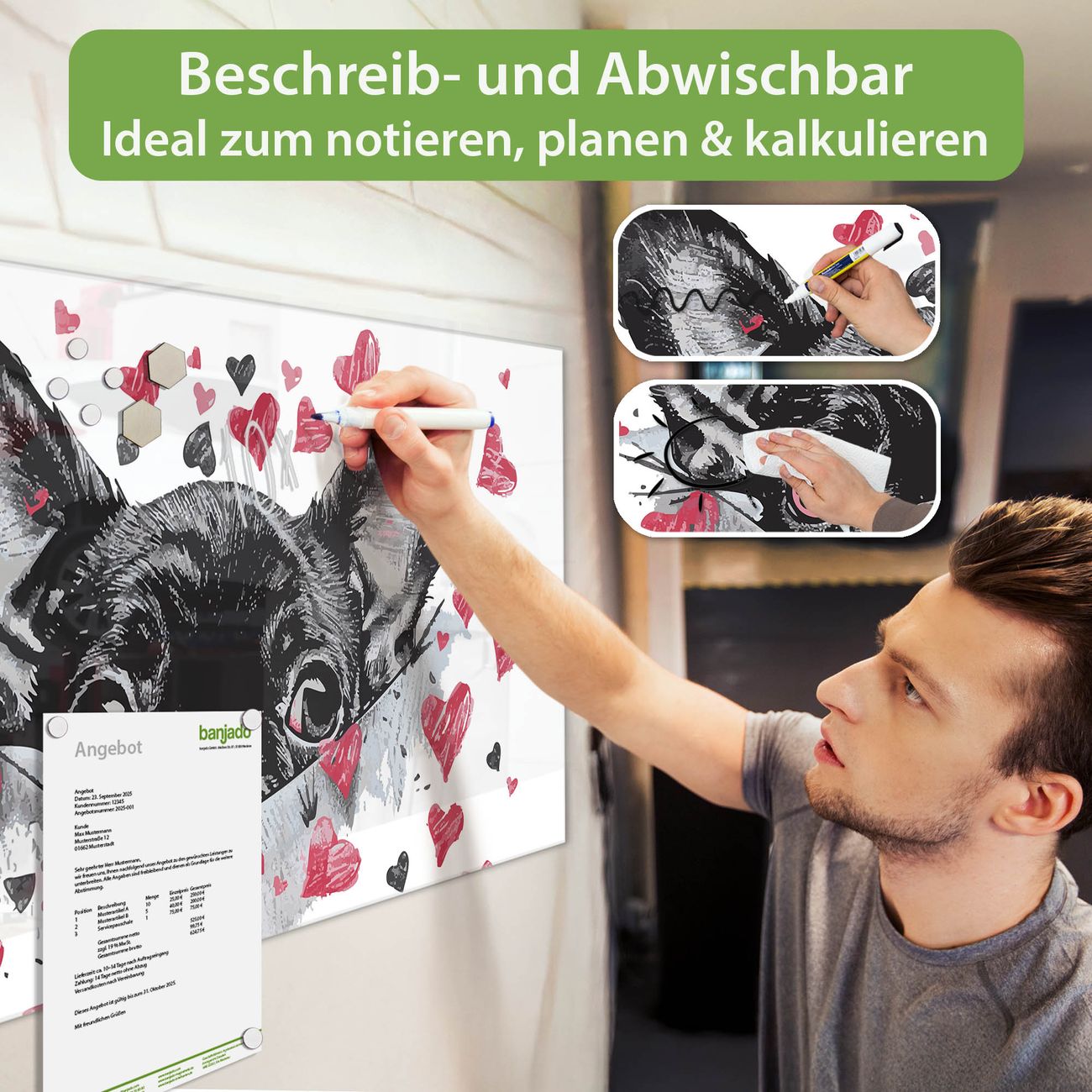 Jede Glas Magnettafel wird in unserer Werkstatt von Hand gefertigt und sorgfältig geprüft. So erhalten Sie ein echtes Qualitätsprodukt, das Funktion und Ästhetik perfekt vereint.?? Warum banjado?