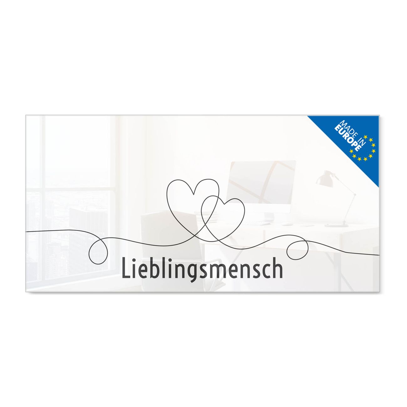 Material: 4mm Sicherheitsglas mit Metallrückwand Eigenschaften: beschreibbar, magnetisch, kratzfest Maße: 100x50x0,6cm, 7,50kg schwer Motiv Nummer 13110 Lieblingsmensch Herz Lineart 2 Zubehör: inklusive 4 Neodym-Magnete