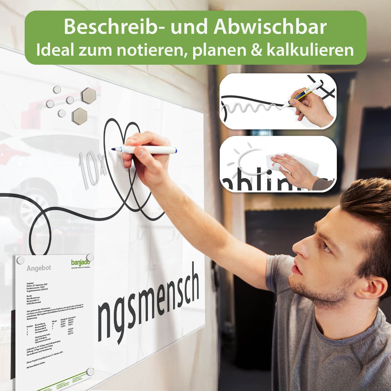 Bitte beachten Sie, dass ausschliessliche spezielle Magnete an der Glastafel haften. Wir empfehlen banjado Neodym Magnete, diese sind durch uns auf Wirksamkeit geprüft.