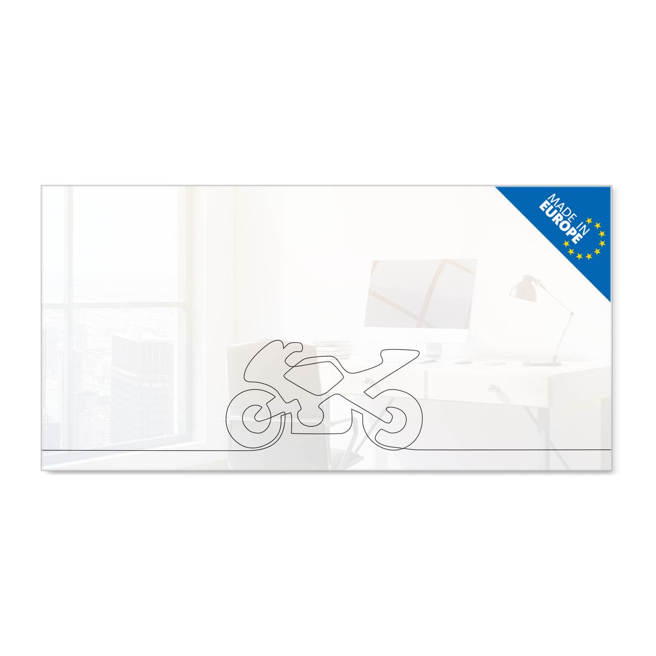 Material: 4mm Sicherheitsglas mit Metallrückwand Eigenschaften: beschreibbar, magnetisch, kratzfest Maße: 120x60x0,6cm, 10,80kg schwer Motiv Nummer 13104 Lineart Motorrad Zubehör: inklusive 4 Neodym-Magnete