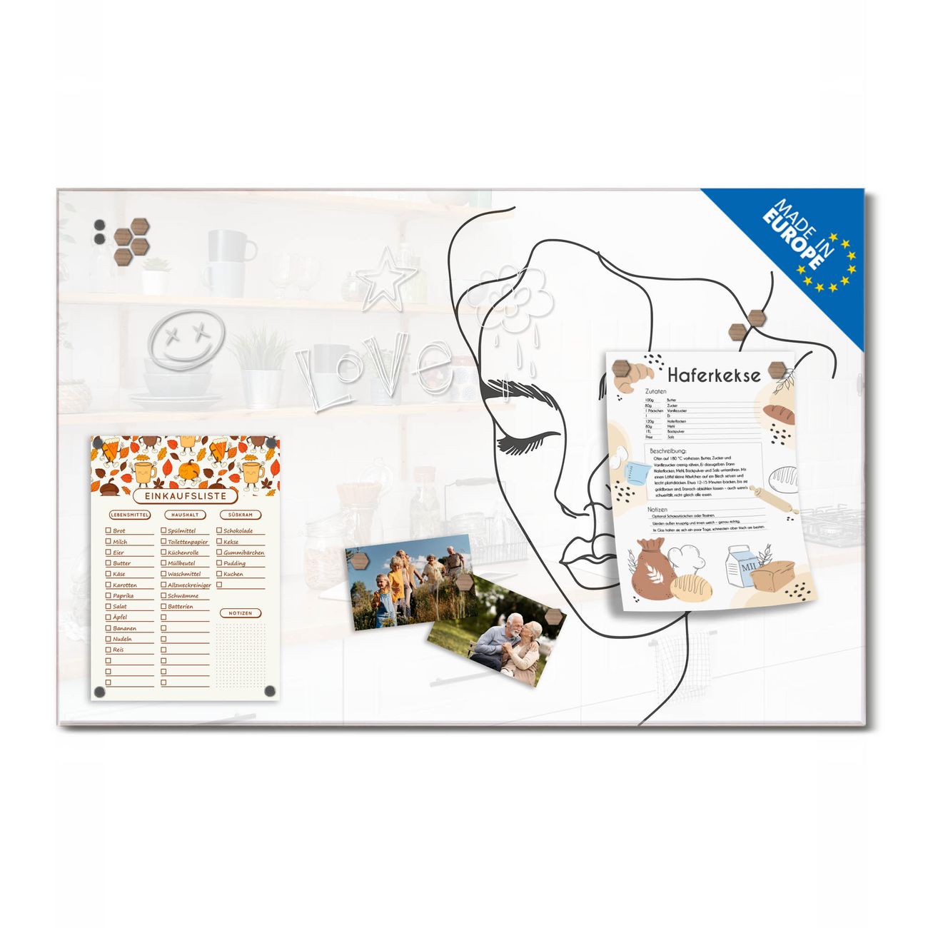 Ein Stück Design, das Ihren Alltag organisiert. Schreiben, heften, inspirieren - alles an einem Ort. Qualität, die man spürt. Montage leicht gemacht. Handwerk mit Herz - veredelt in Sachsen. Einzigartiges Design mit Motiv Motiv Linienkunst-Portrait Beschreibbare Glasoberfläche, leicht zu reinigen Starke Magnetkraft durch Stahlrückwand Inklusive 4 Neodym-Magneten Flexible Montageoptionen Handveredelt in Sachsen - Qualität, die bleibt