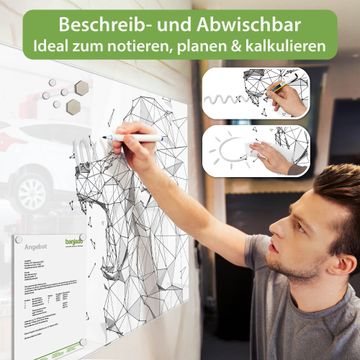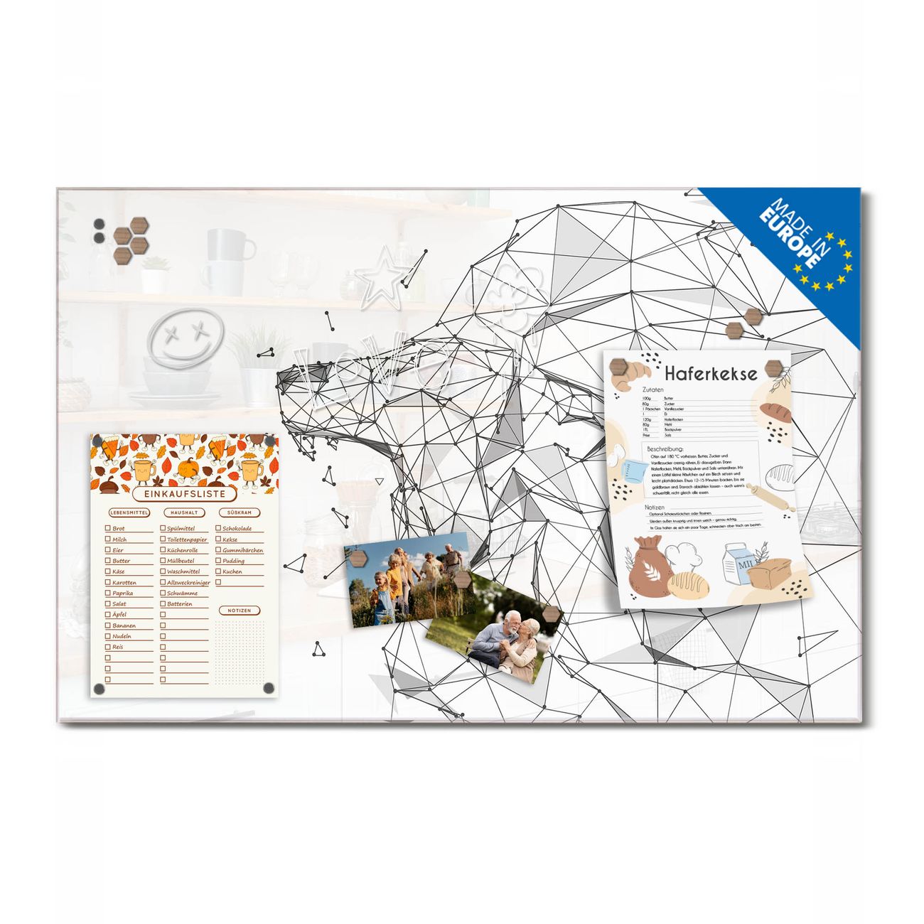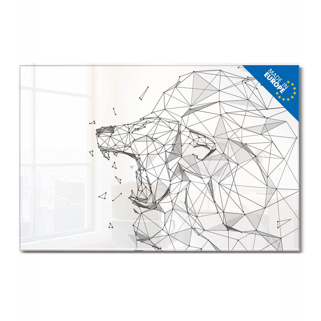 Material: 4mm Sicherheitsglas mit Metallrückwand Eigenschaften: beschreibbar, magnetisch, kratzfest Maße: 90x60x0,6cm, 8,10kg schwer Motiv Nummer 13023 Löwe abstrakt 2 Zubehör: inklusive 4 Neodym-Magnete