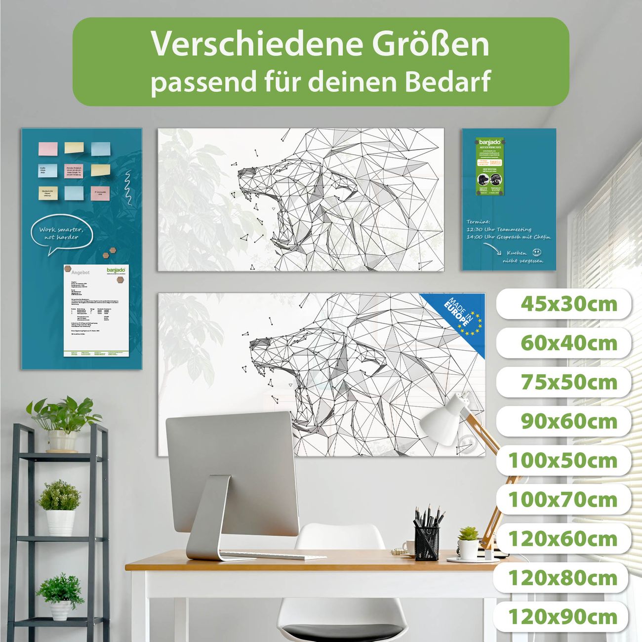 Material: 4mm Sicherheitsglas mit Metallrückwand Eigenschaften: beschreibbar, magnetisch, kratzfest Maße: 100x50x0,6cm, 7,50kg schwer Motiv Nummer 13023 Löwe abstrakt 2 Zubehör: inklusive 4 Neodym-Magnete