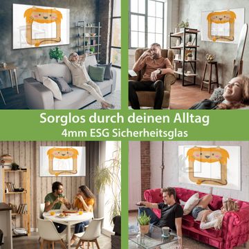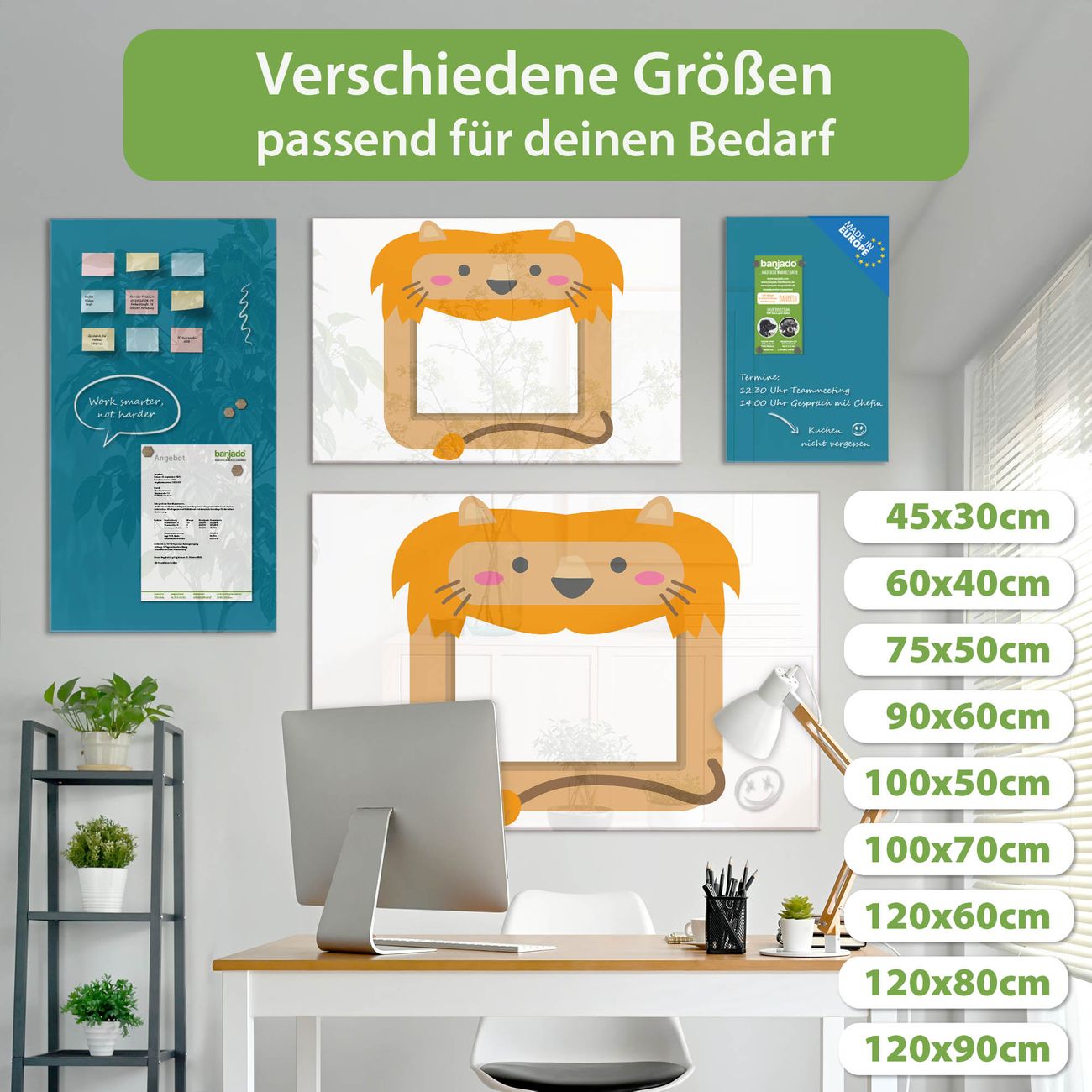 Material: 4mm Sicherheitsglas mit Metallrückwand Eigenschaften: beschreibbar, magnetisch, kratzfest Maße: 75x50x0,6cm, 5,63kg schwer Motiv Nummer 13260 Löwenbilderrahmen Zubehör: inklusive 4 Neodym-Magnete