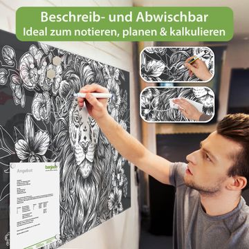 Auf der glatten Glasoberfläche lassen sich Termine, Rezepte oder Notizen ganz einfach mit Kreidestiften festhalten und rückstandslos entfernen. Starke Neodym-Magnete halten Ihre wichtigsten Erinnerungen sicher an Ort und Stelle. So entsteht Ihre ganz persönliche Ideenwand - jeden Tag neu.
