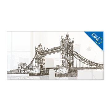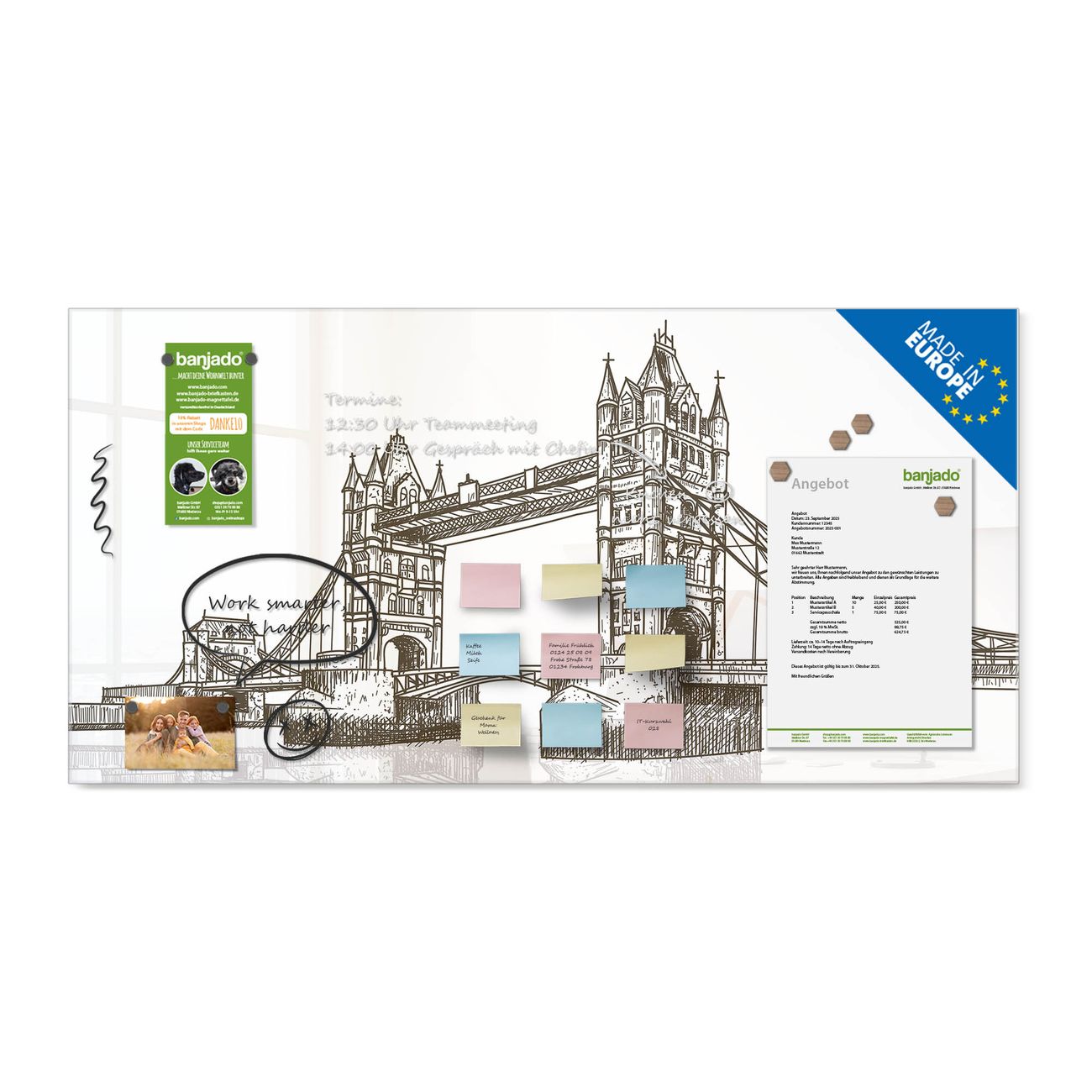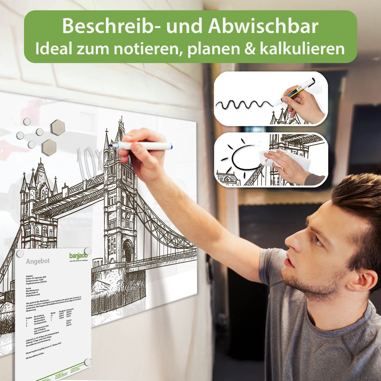 Material: 4mm Sicherheitsglas mit Metallrückwand Eigenschaften: beschreibbar, magnetisch, kratzfest Maße: 100x50x0,6cm, 7,50kg schwer Motiv Nummer 13243 London Brücke Illustration Zubehör: inklusive 4 Neodym-Magnete