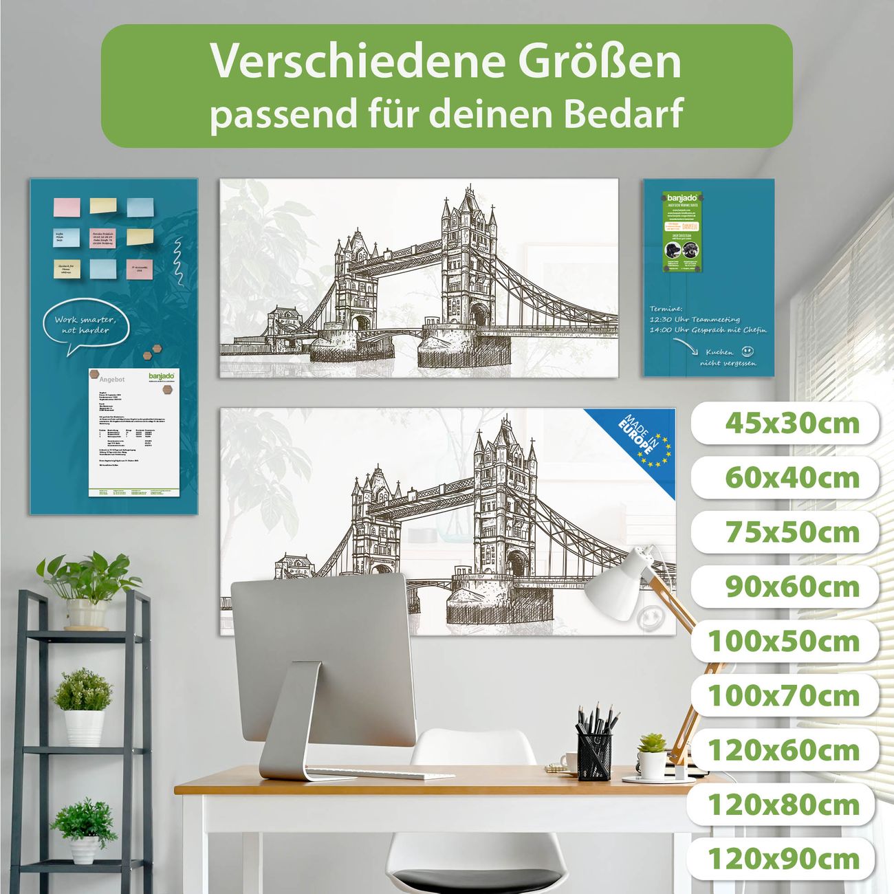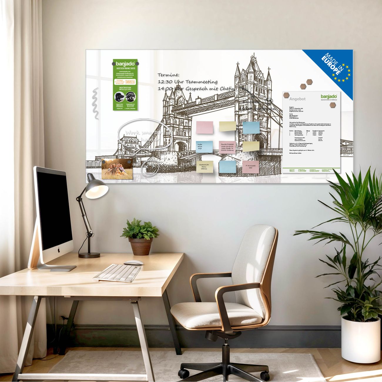 Ein Stück Design, das Ihren Alltag organisiert. Schreiben, heften, inspirieren - alles an einem Ort. Qualität, die man spürt. Montage leicht gemacht. Handwerk mit Herz - veredelt in Sachsen. Einzigartiges Design mit Motiv Motiv London Brücke Illustration Beschreibbare Glasoberfläche, leicht zu reinigen Starke Magnetkraft durch Stahlrückwand Inklusive 4 Neodym-Magneten Flexible Montageoptionen Handveredelt in Sachsen - Qualität, die bleibt