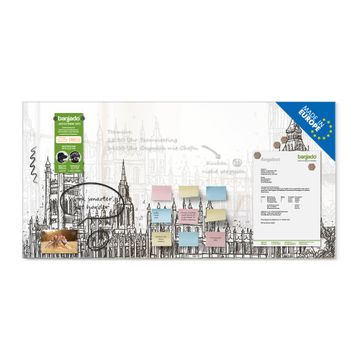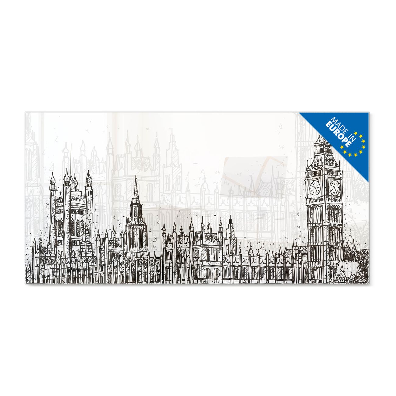 Material: 4mm Sicherheitsglas mit Metallrückwand Eigenschaften: beschreibbar, magnetisch, kratzfest Maße: 100x50x0,6cm, 7,50kg schwer Motiv Nummer 13242 London Skyline Skizze Zubehör: inklusive 4 Neodym-Magnete