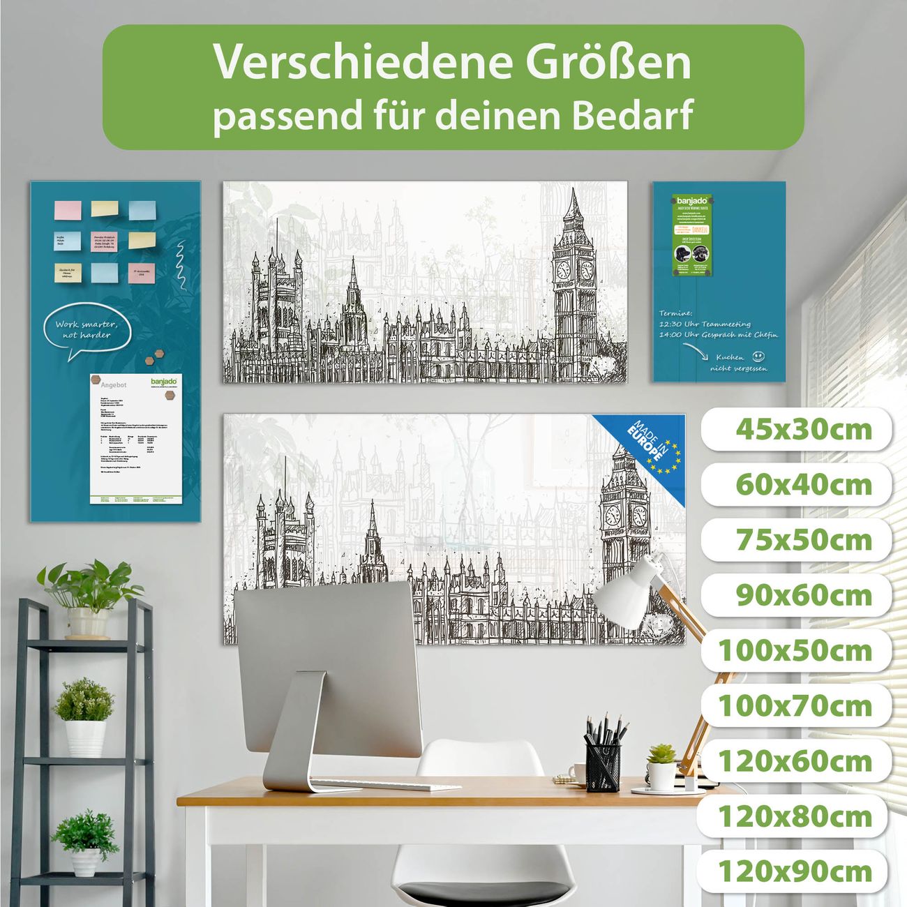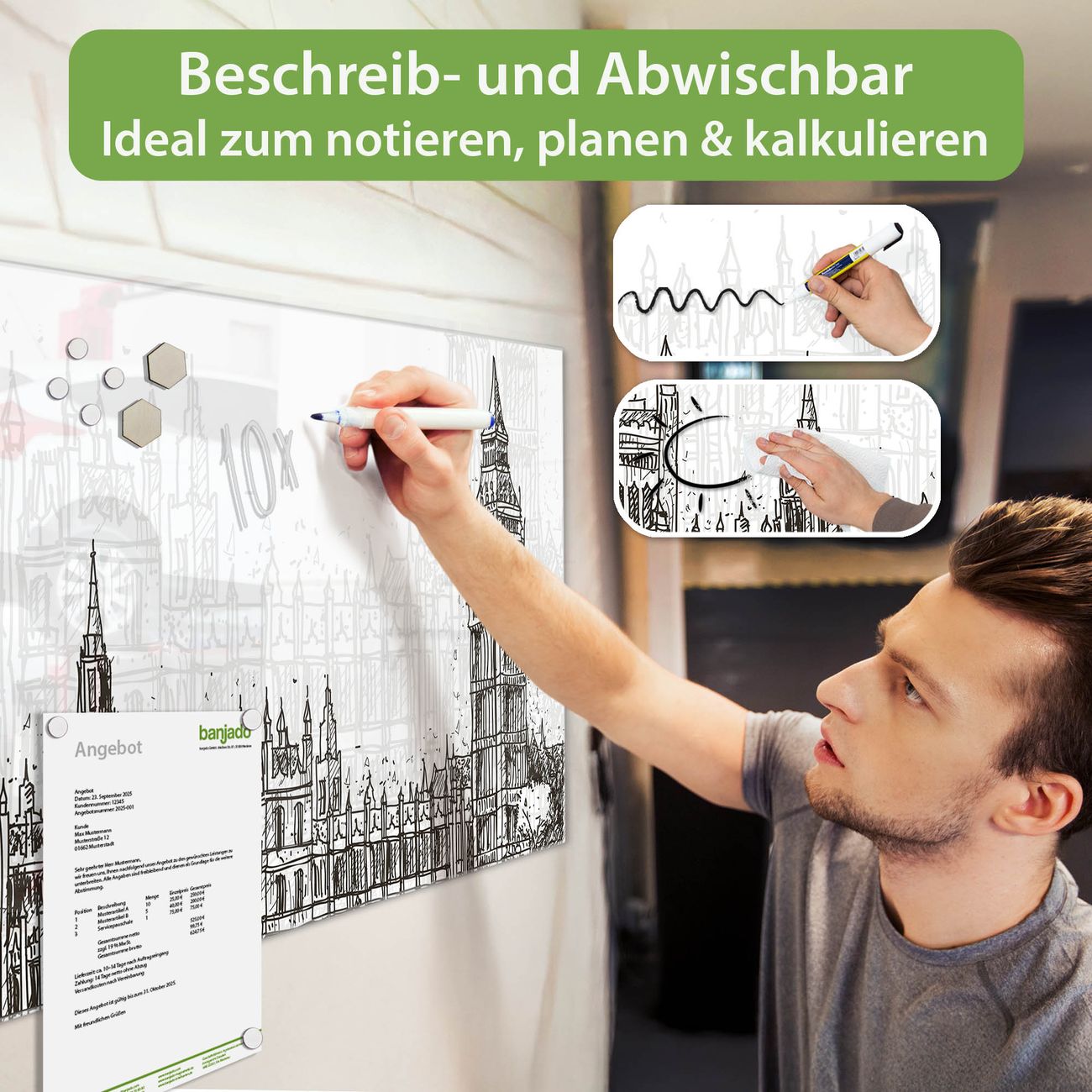 Jede Glas Magnettafel wird in unserer Werkstatt von Hand gefertigt und sorgfältig geprüft. So erhalten Sie ein echtes Qualitätsprodukt, das Funktion und Ästhetik perfekt vereint.?? Warum banjado?