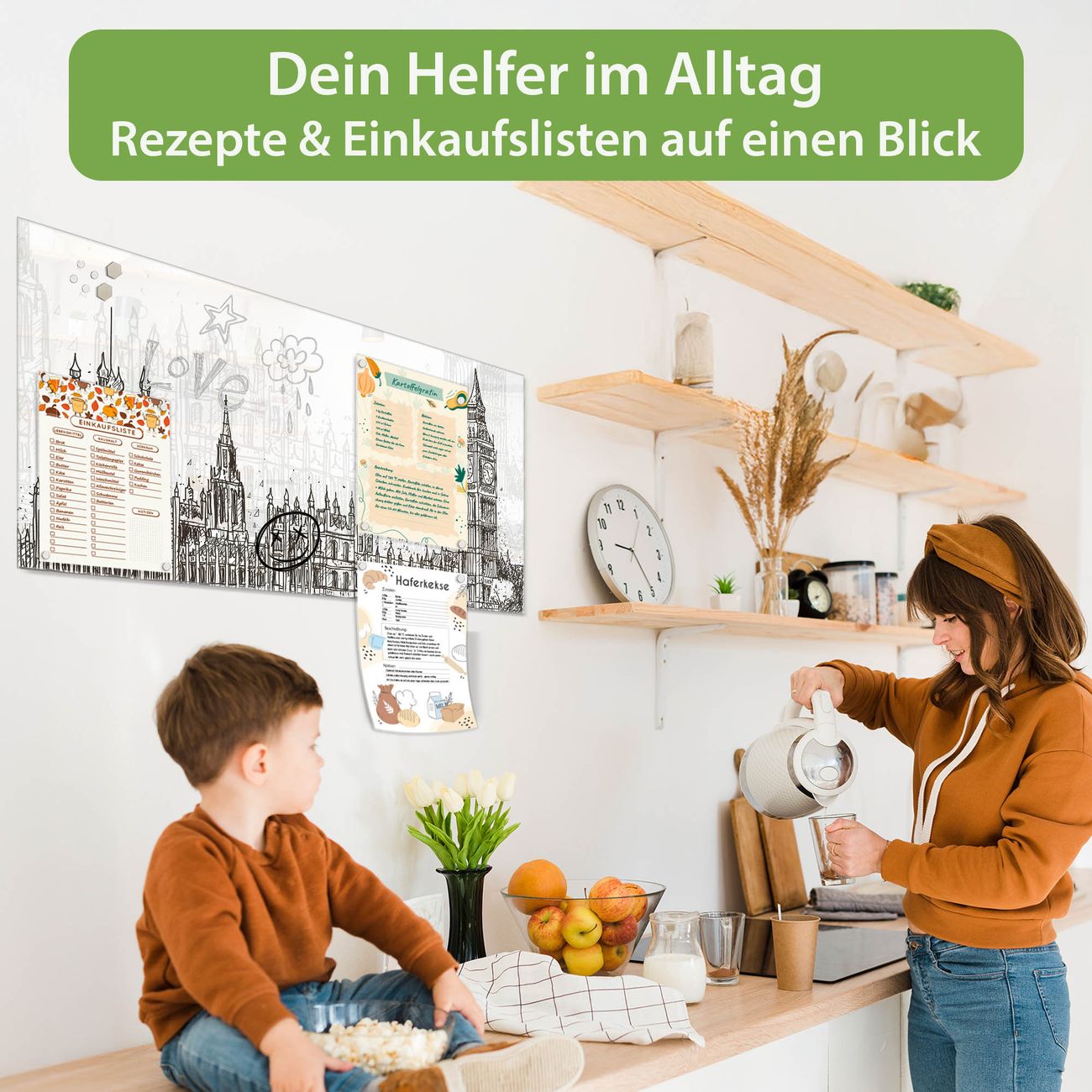 Auf der glatten Glasoberfläche lassen sich Termine, Rezepte oder Notizen ganz einfach mit Kreidestiften festhalten und rückstandslos entfernen. Starke Neodym-Magnete halten Ihre wichtigsten Erinnerungen sicher an Ort und Stelle. So entsteht Ihre ganz persönliche Ideenwand - jeden Tag neu.