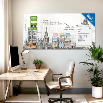 Die banjado Glas Magnettafel mit dem Motiv Motiv London Skyline Skizze verbindet Funktionalität mit Stil. Sie ersetzt das Zettelchaos durch klare Strukturen und bringt dabei eine warme, natürliche Atmosphäre in Ihr Zuhause. Ob im Büro, in der Küche oder im Eingangsbereich - dieses Design-Board zieht Blicke an und sorgt für Ordnung mit Charakter.