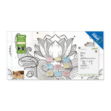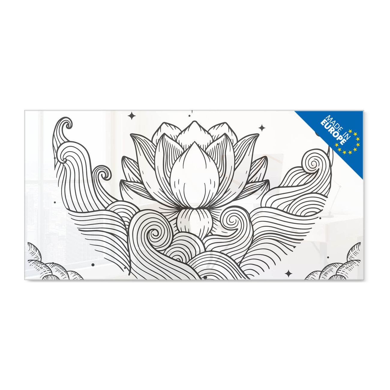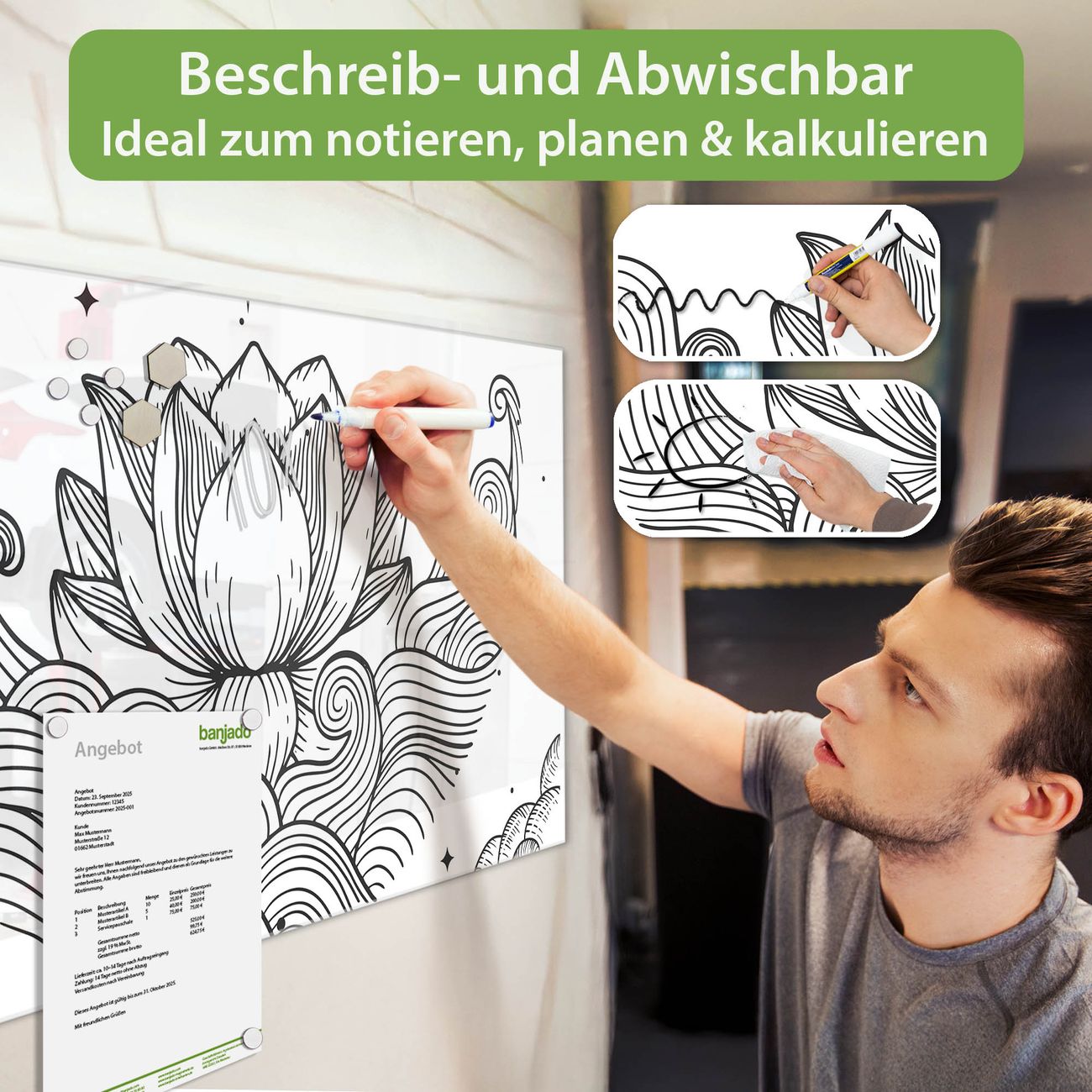 Material: 4mm Sicherheitsglas mit Metallrückwand Eigenschaften: beschreibbar, magnetisch, kratzfest Maße: 100x50x0,6cm, 7,50kg schwer Motiv Nummer 13060 Lotus und Mondphasen 2 Zubehör: inklusive 4 Neodym-Magnete
