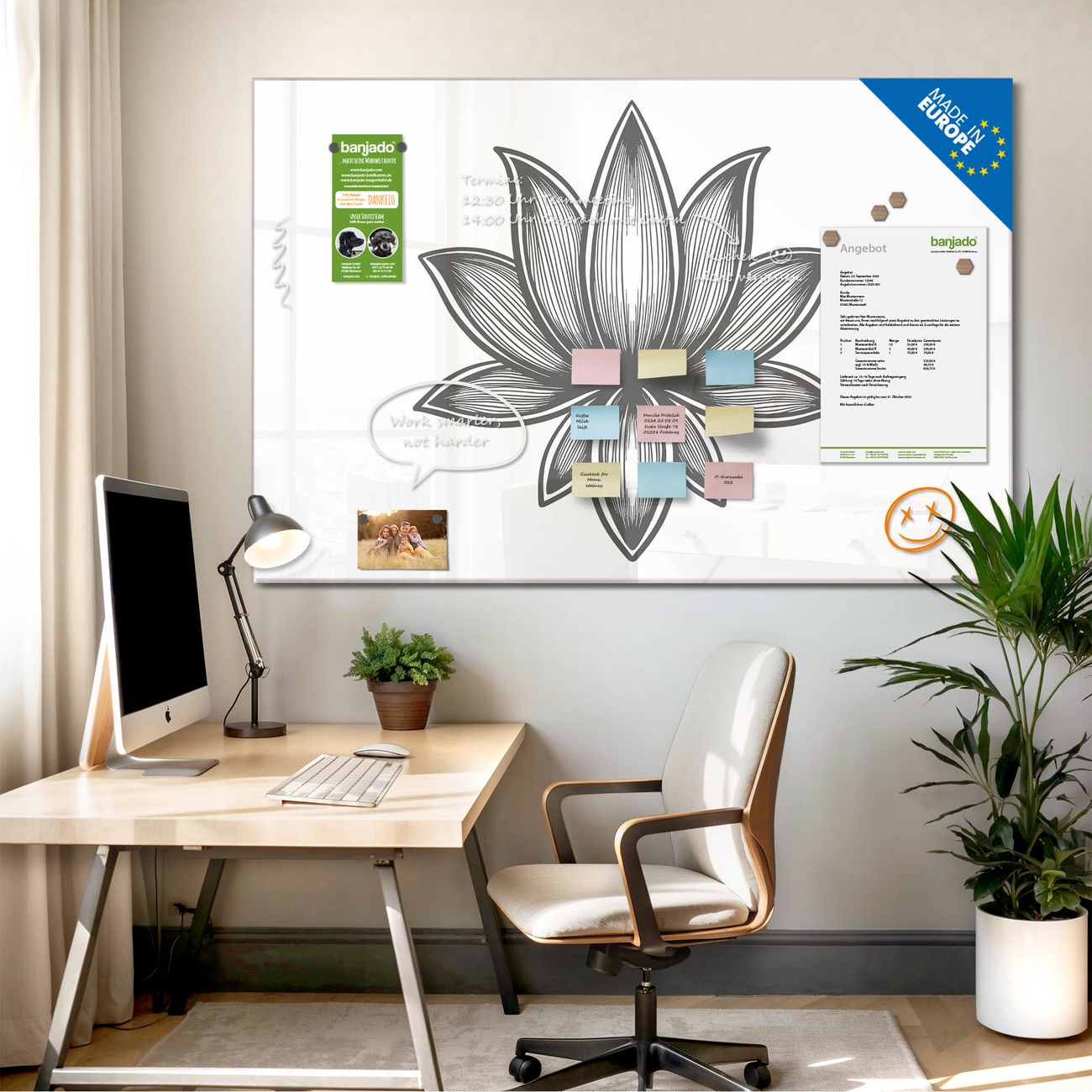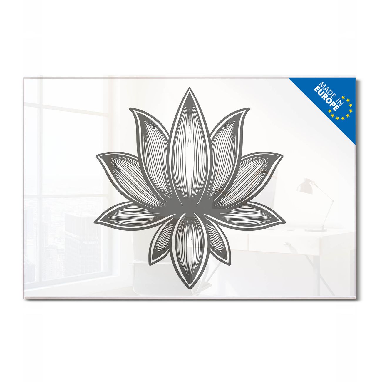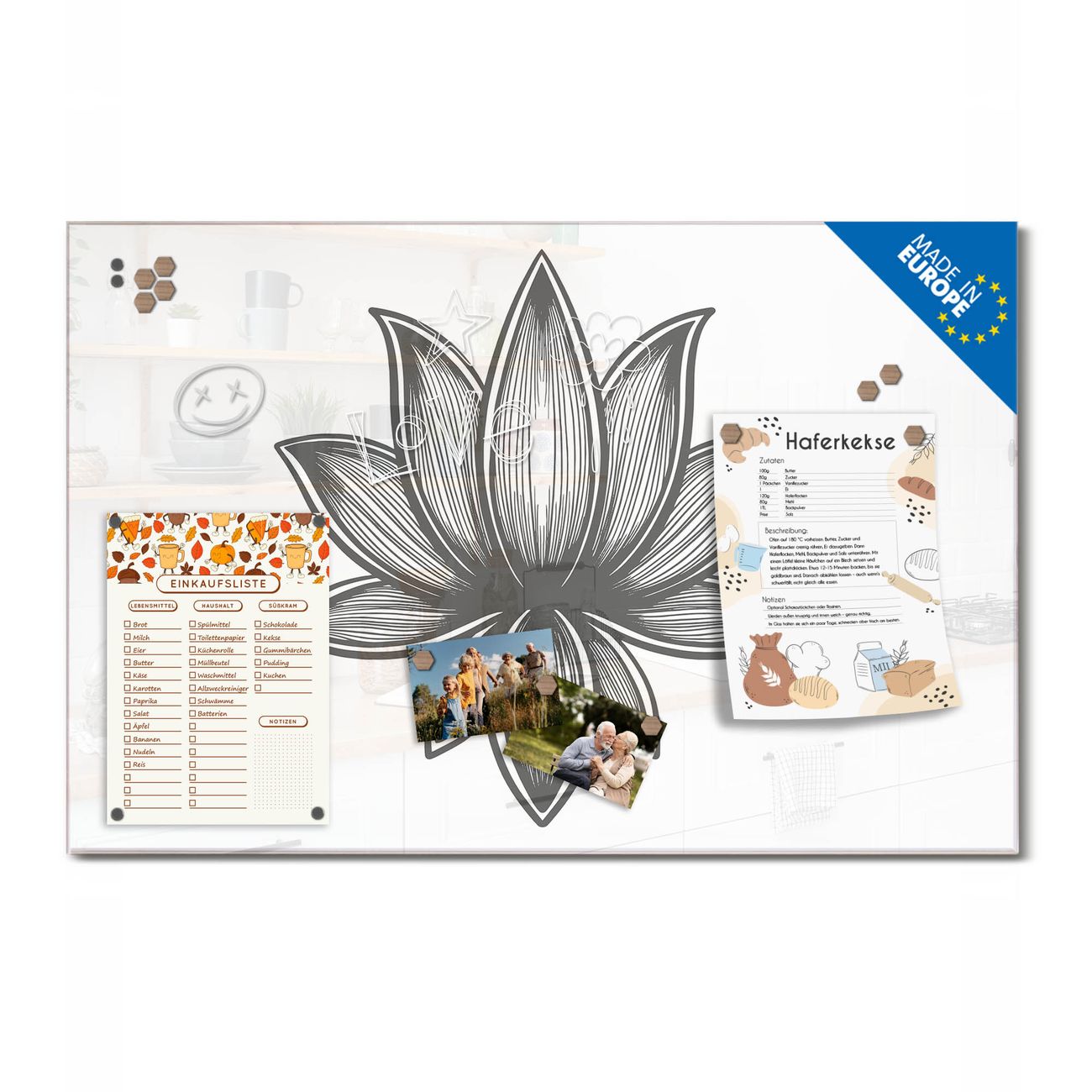Material: 4mm Sicherheitsglas mit Metallrückwand Eigenschaften: beschreibbar, magnetisch, kratzfest Maße: 90x60x0,6cm, 8,10kg schwer Motiv Nummer 13065 Lotusblüte 10 Zubehör: inklusive 4 Neodym-Magnete
