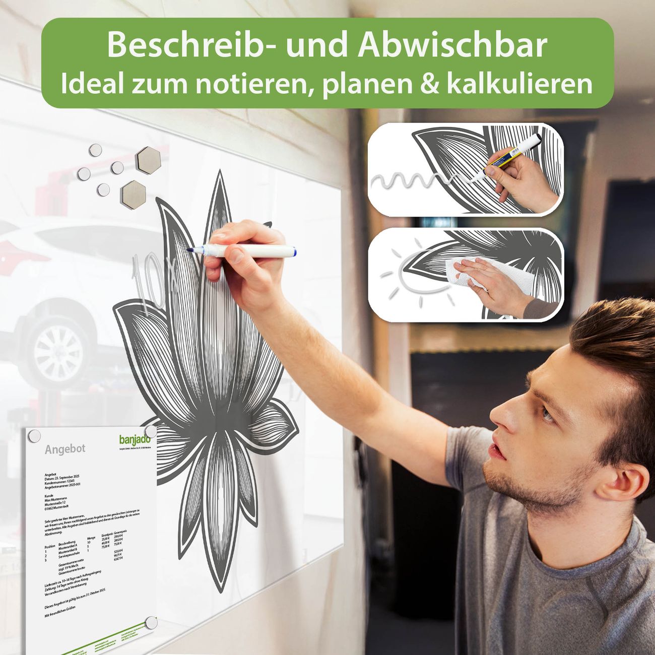 Jede Glas Magnettafel wird in unserer Werkstatt von Hand gefertigt und sorgfältig geprüft. So erhalten Sie ein echtes Qualitätsprodukt, das Funktion und Ästhetik perfekt vereint.?? Warum banjado?