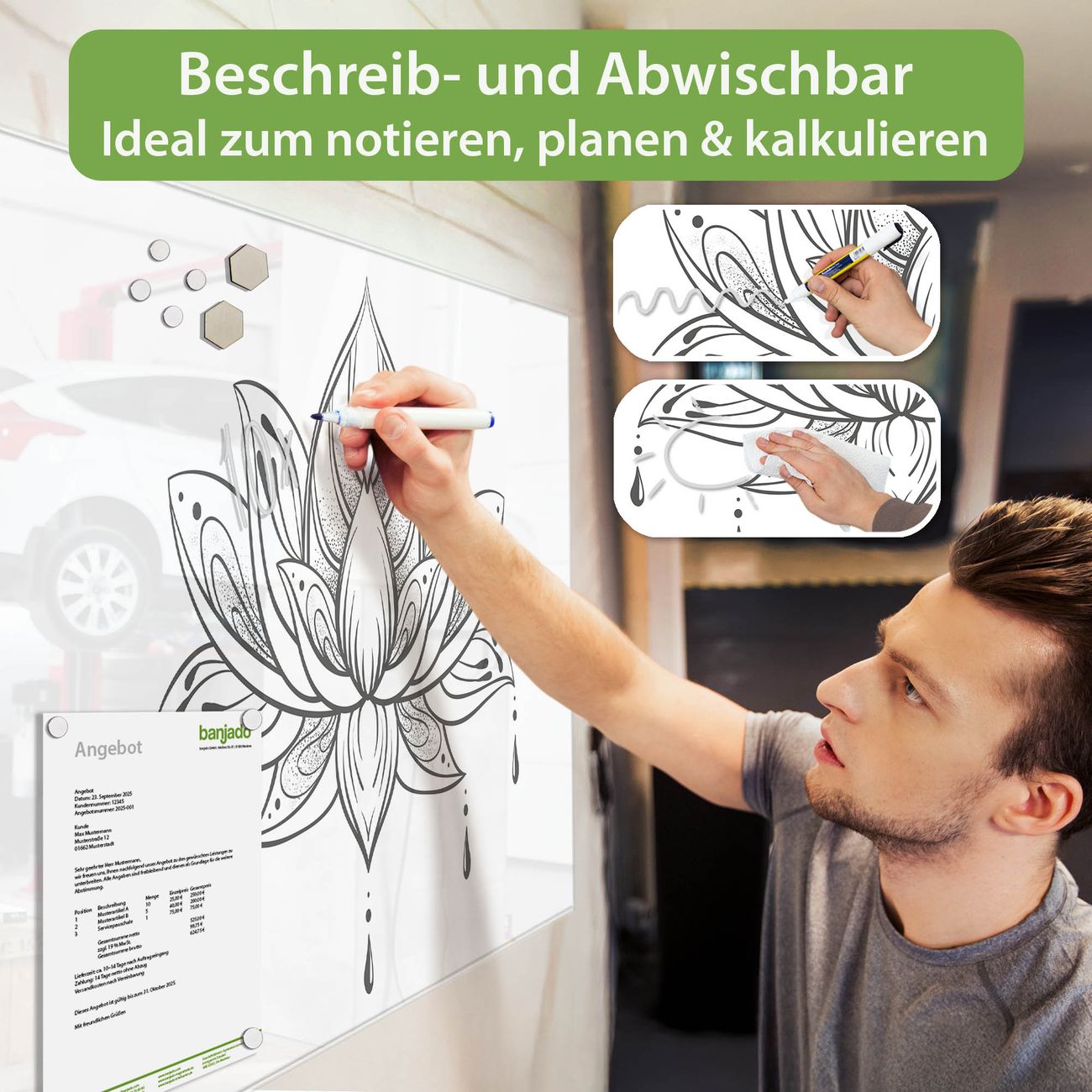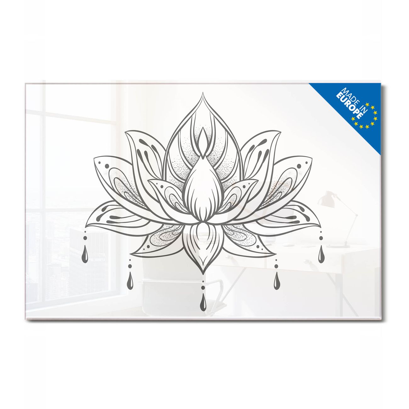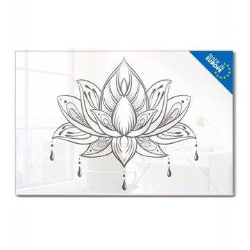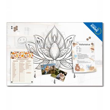 Material: 4mm Sicherheitsglas mit Metallrückwand Eigenschaften: beschreibbar, magnetisch, kratzfest Maße: 90x60x0,6cm, 8,10kg schwer Motiv Nummer 13061 Lotusblüte 6 Zubehör: inklusive 4 Neodym-Magnete
