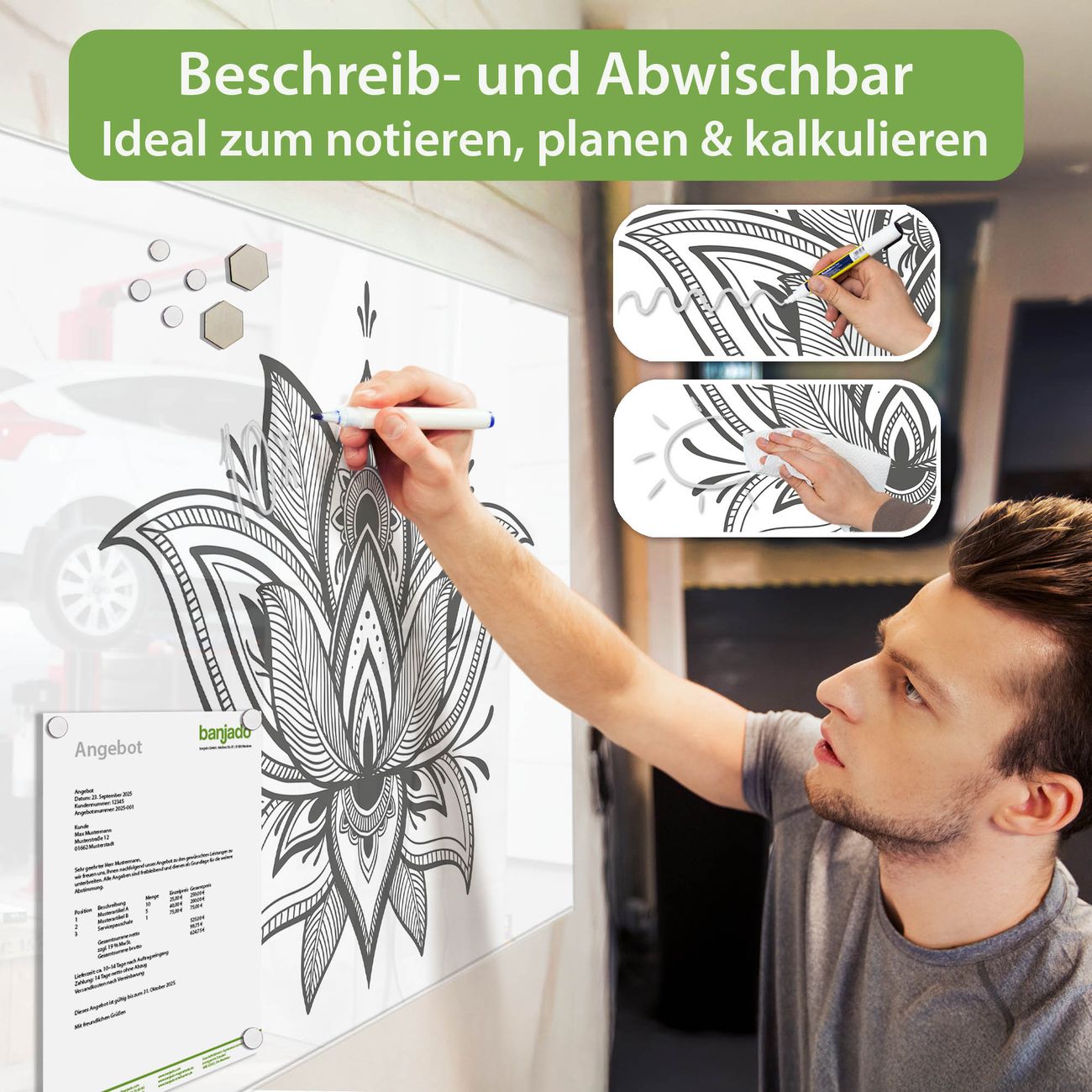 Jede Glas Magnettafel wird in unserer Werkstatt von Hand gefertigt und sorgfältig geprüft. So erhalten Sie ein echtes Qualitätsprodukt, das Funktion und Ästhetik perfekt vereint.?? Warum banjado?