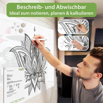 Auf der glatten Glasoberfläche lassen sich Termine, Rezepte oder Notizen ganz einfach mit Kreidestiften festhalten und rückstandslos entfernen. Starke Neodym-Magnete halten Ihre wichtigsten Erinnerungen sicher an Ort und Stelle. So entsteht Ihre ganz persönliche Ideenwand - jeden Tag neu.