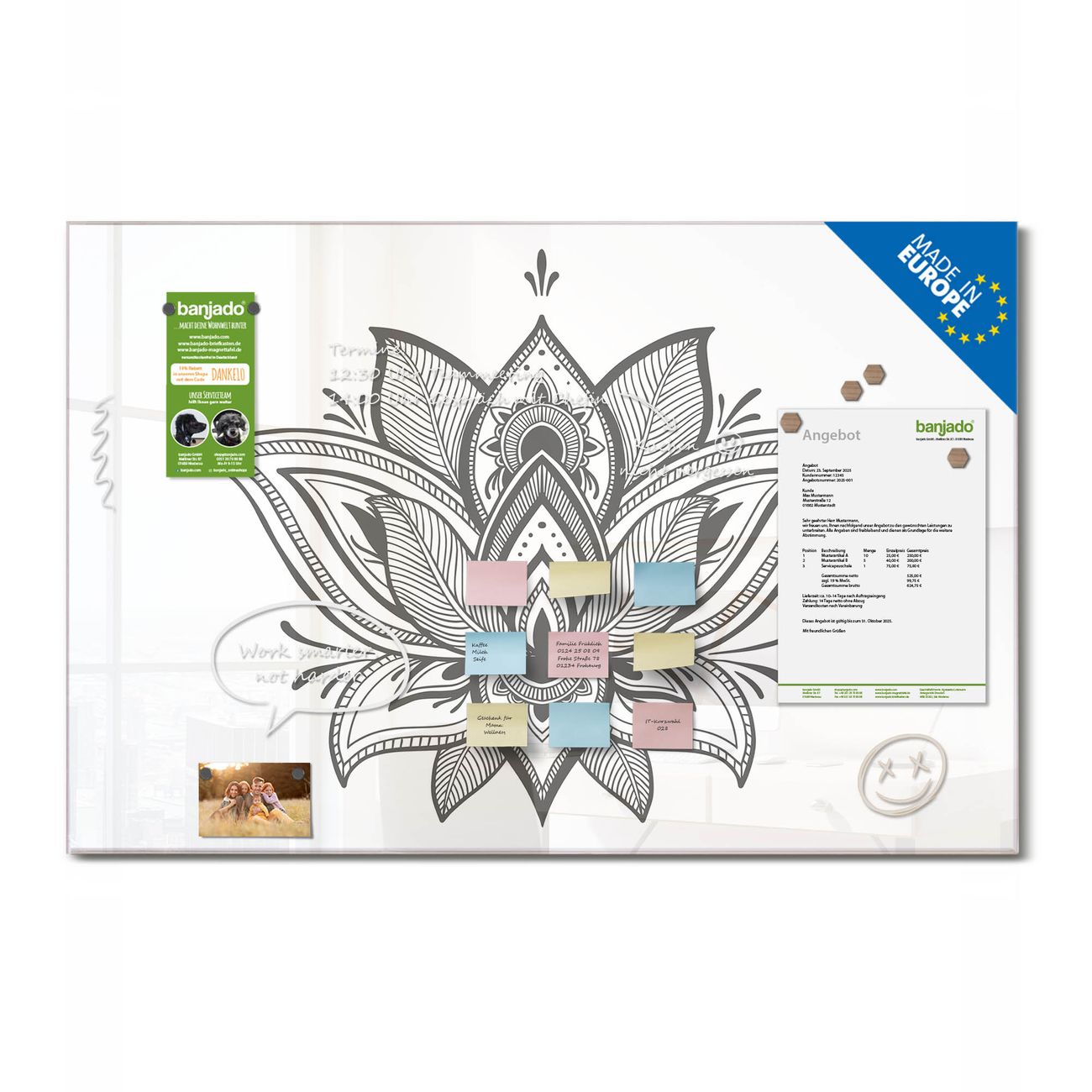 Jede Glas Magnettafel wird in unserer Werkstatt von Hand gefertigt und sorgfältig geprüft. So erhalten Sie ein echtes Qualitätsprodukt, das Funktion und Ästhetik perfekt vereint.?? Warum banjado?