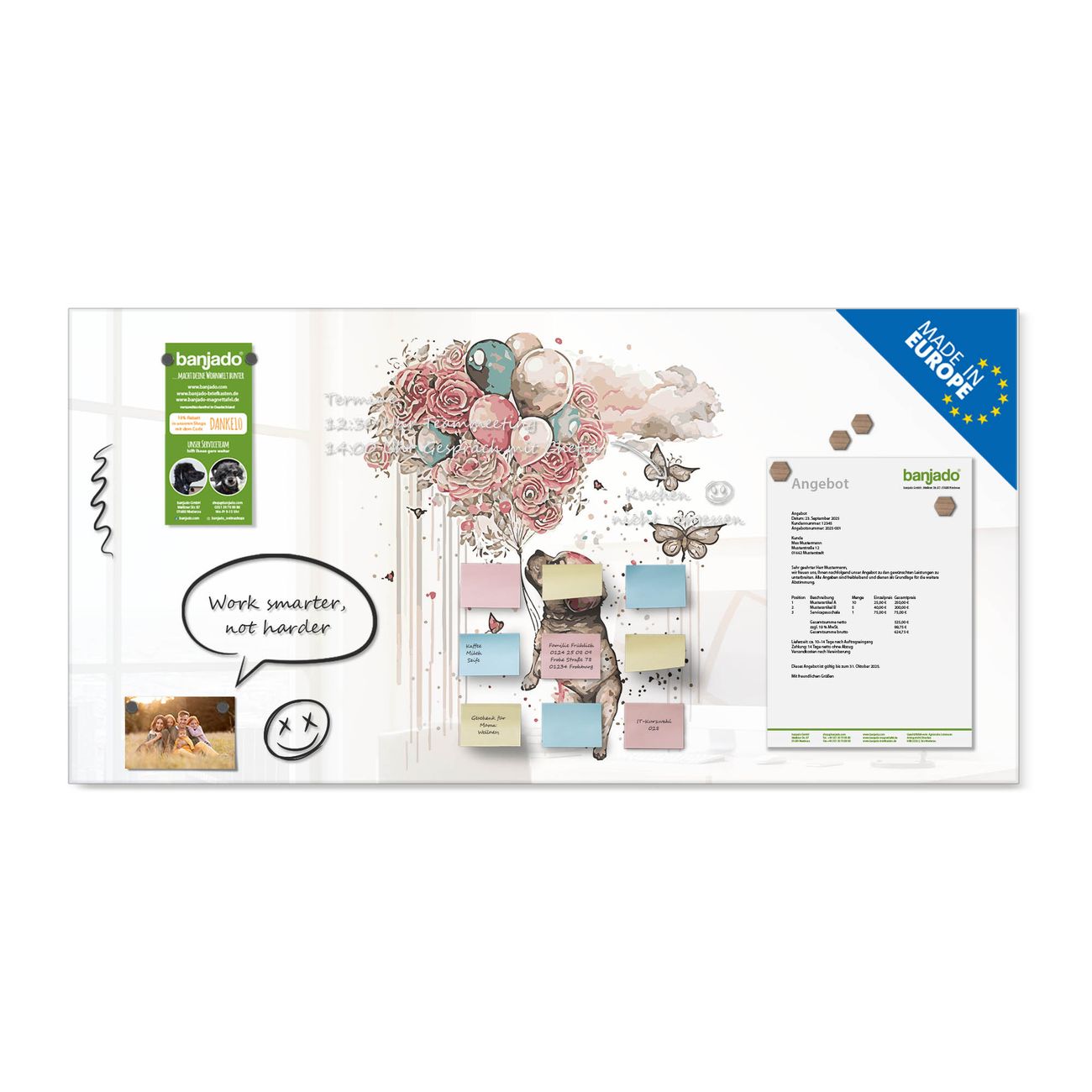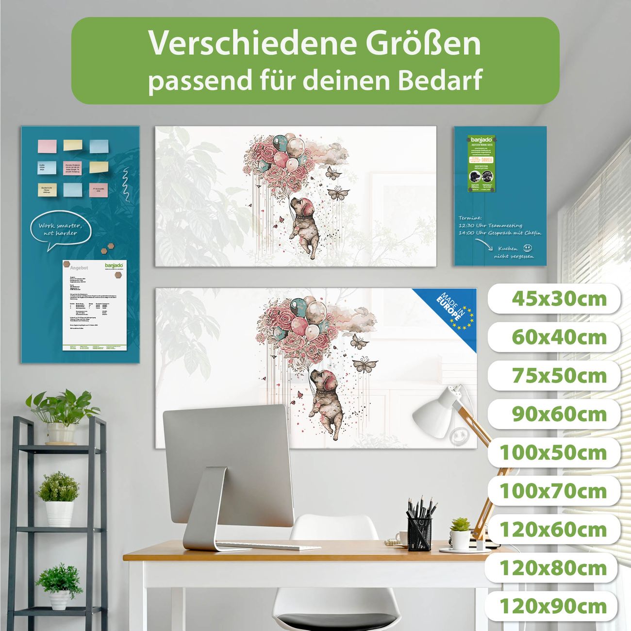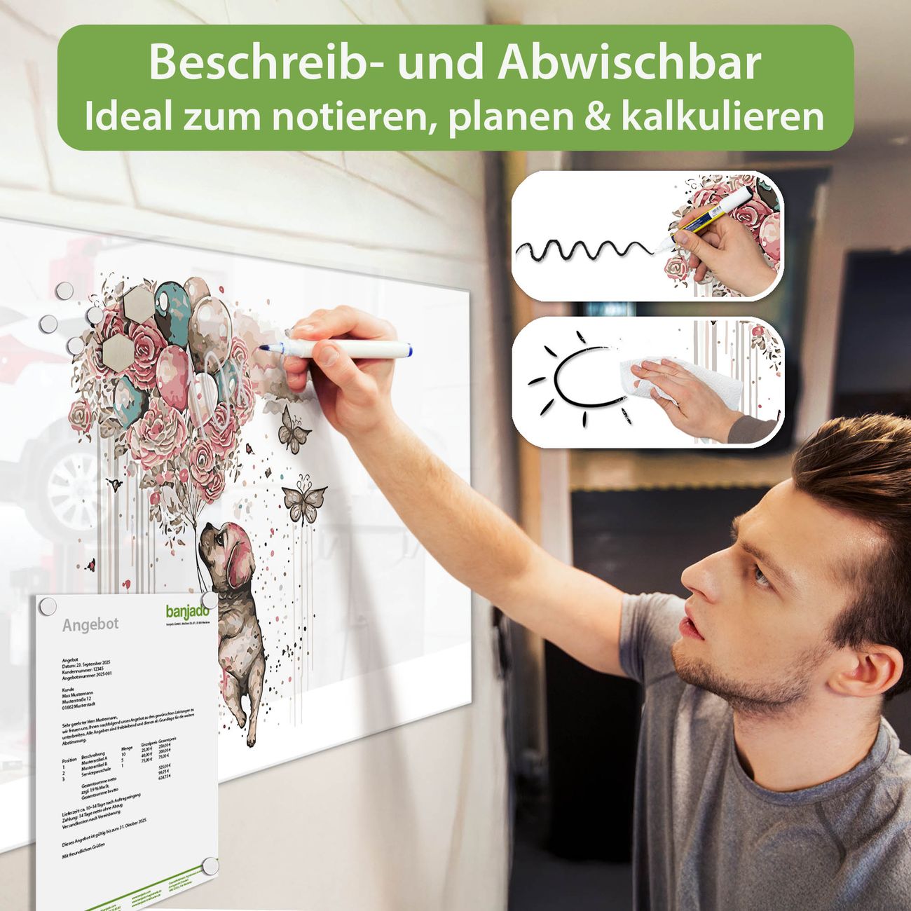 Jede Glas Magnettafel wird in unserer Werkstatt von Hand gefertigt und sorgfältig geprüft. So erhalten Sie ein echtes Qualitätsprodukt, das Funktion und Ästhetik perfekt vereint.?? Warum banjado?