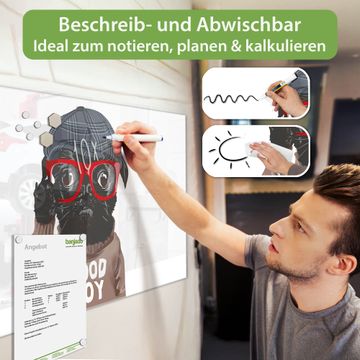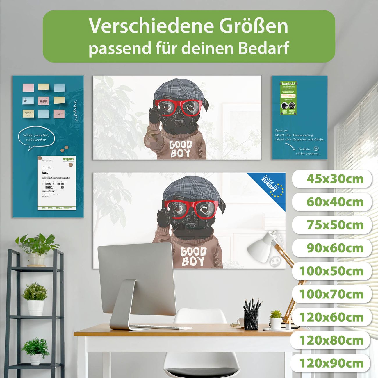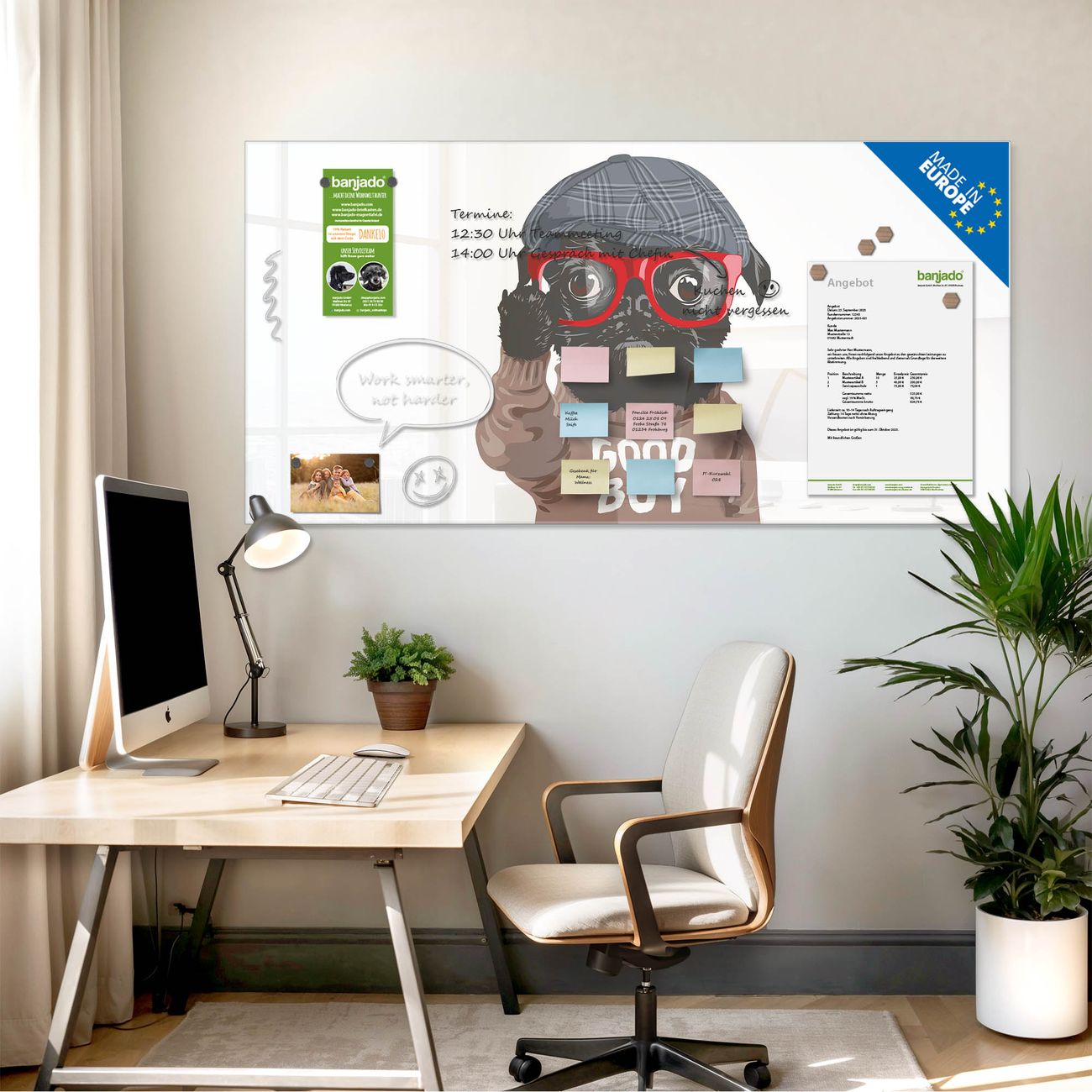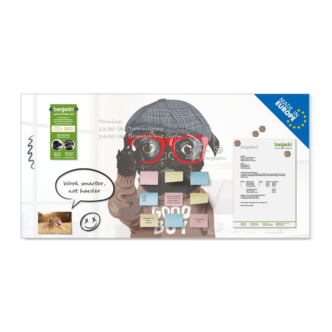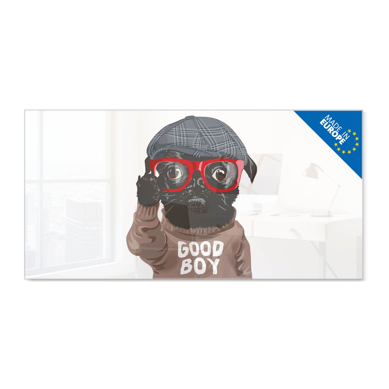 Material: 4mm Sicherheitsglas mit Metallrückwand Eigenschaften: beschreibbar, magnetisch, kratzfest Maße: 100x50x0,6cm, 7,50kg schwer Motiv Nummer 13417 Lustiger Mops mit Brille Zubehör: inklusive 4 Neodym-Magnete
