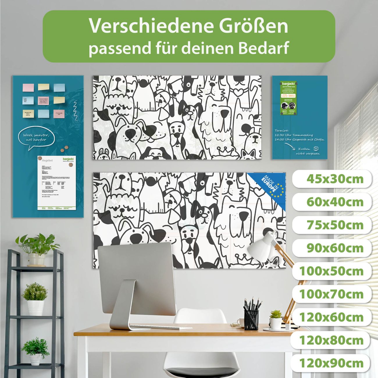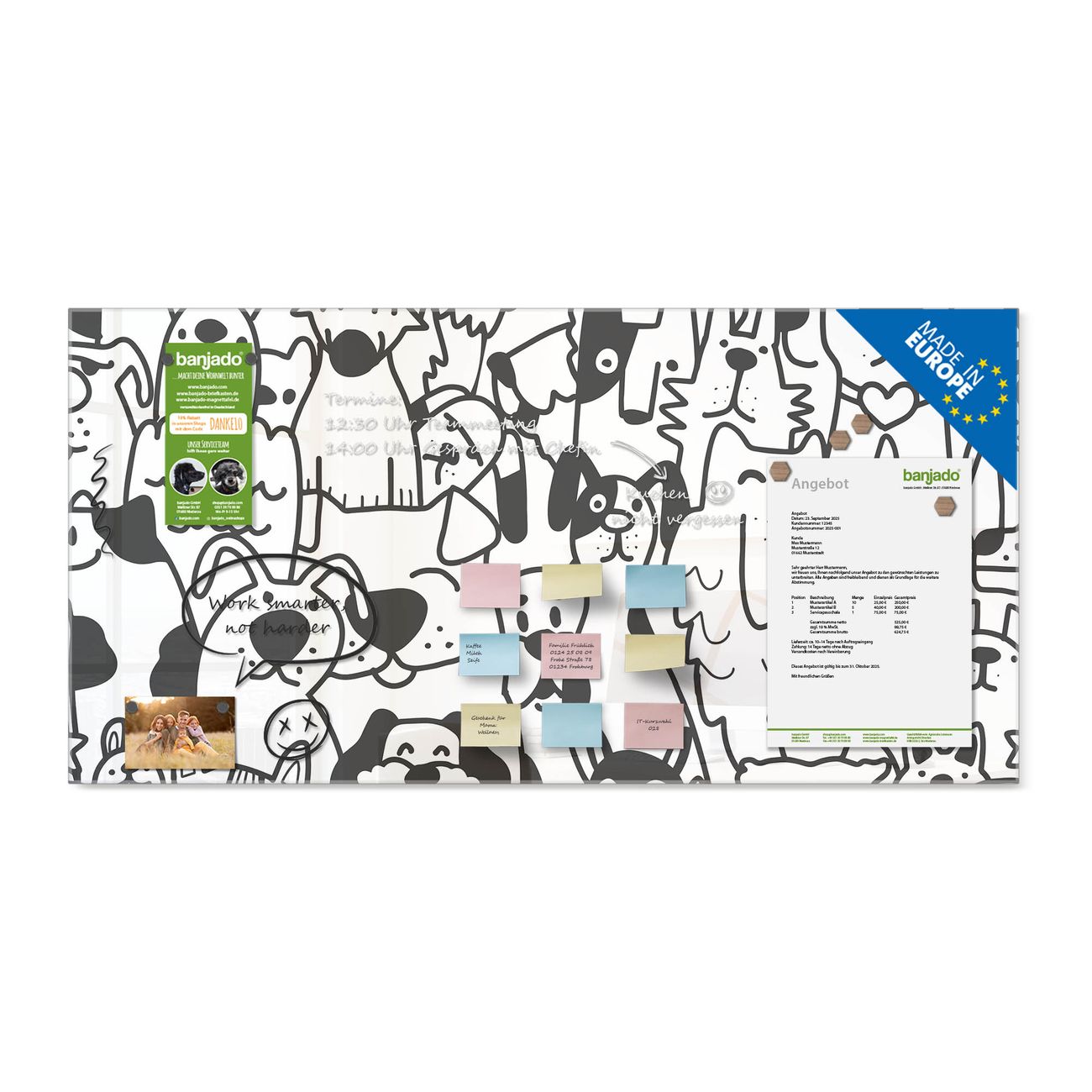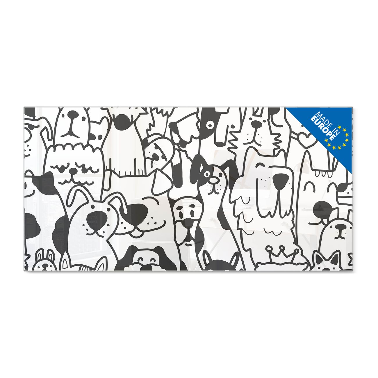 Material: 4mm Sicherheitsglas mit Metallrückwand Eigenschaften: beschreibbar, magnetisch, kratzfest Maße: 100x50x0,6cm, 7,50kg schwer Motiv Nummer 13432 Lustiges Hundemuster Zubehör: inklusive 4 Neodym-Magnete