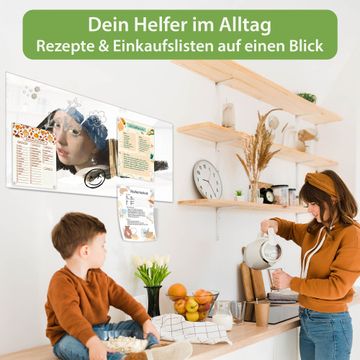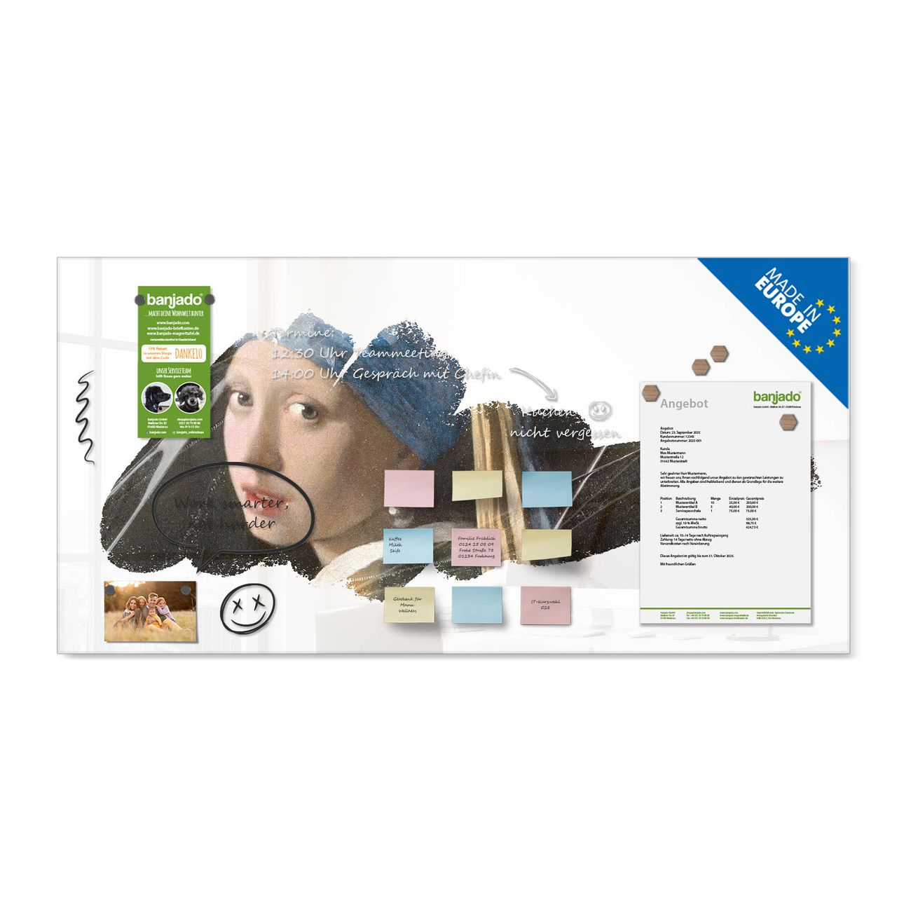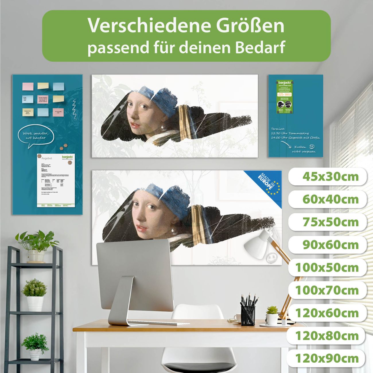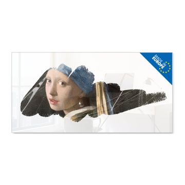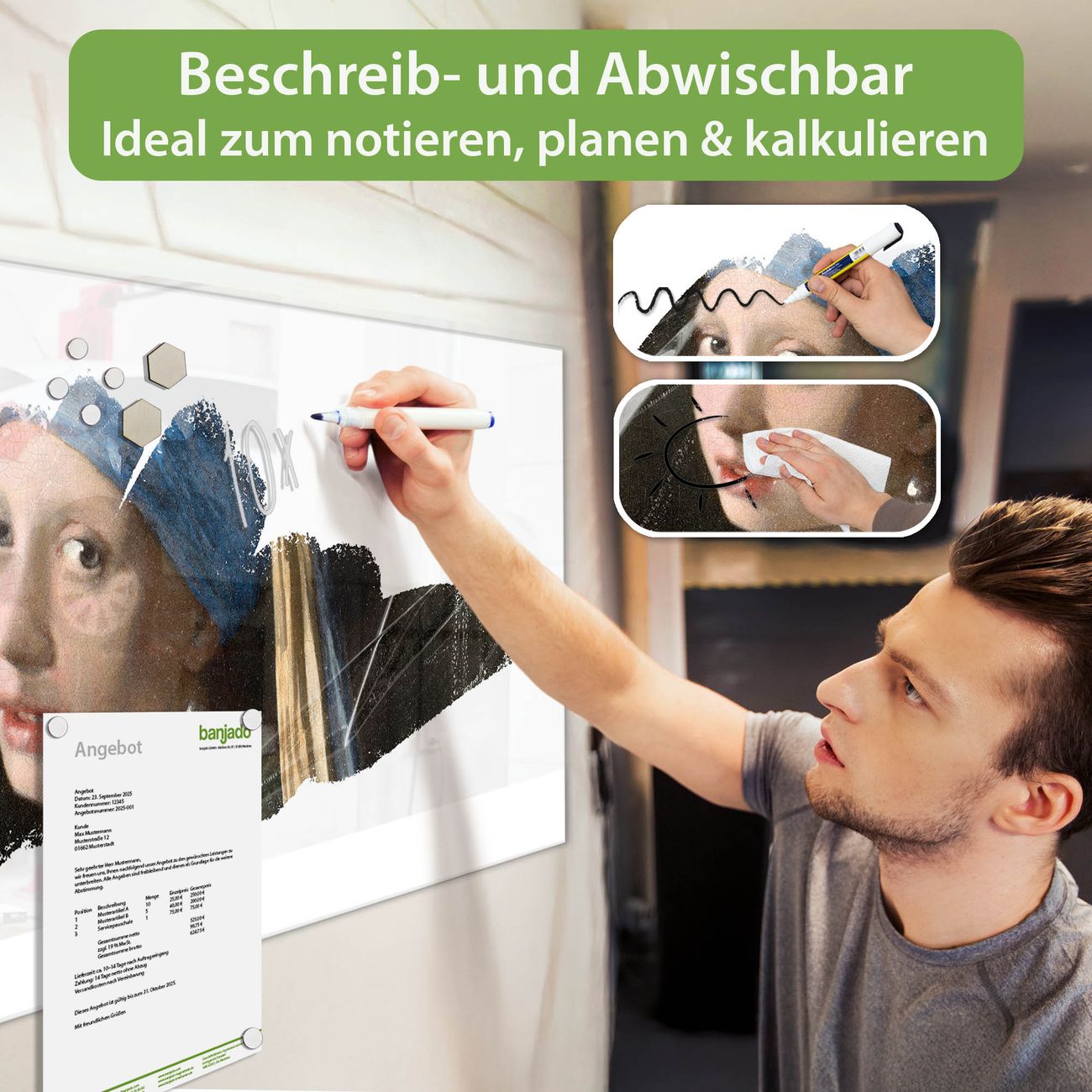 Material: 4mm Sicherheitsglas mit Metallrückwand Eigenschaften: beschreibbar, magnetisch, kratzfest Maße: 100x50x0,6cm, 7,50kg schwer Motiv Nummer 13269 Mädchen mit dem Perlenohrring Zubehör: inklusive 4 Neodym-Magnete