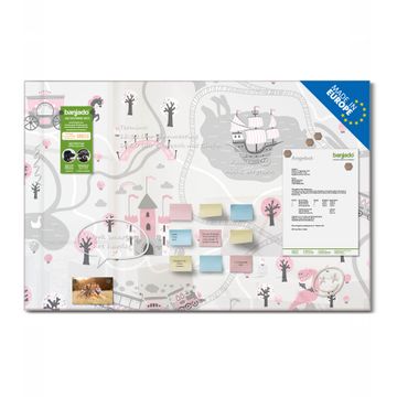 Material: 4mm Sicherheitsglas mit Metallrückwand Eigenschaften: beschreibbar, magnetisch, kratzfest Maße: 120x80x0,6cm, 14,40kg schwer Motiv Nummer 13015 Märchendorf 1 Zubehör: inklusive 4 Neodym-Magnete