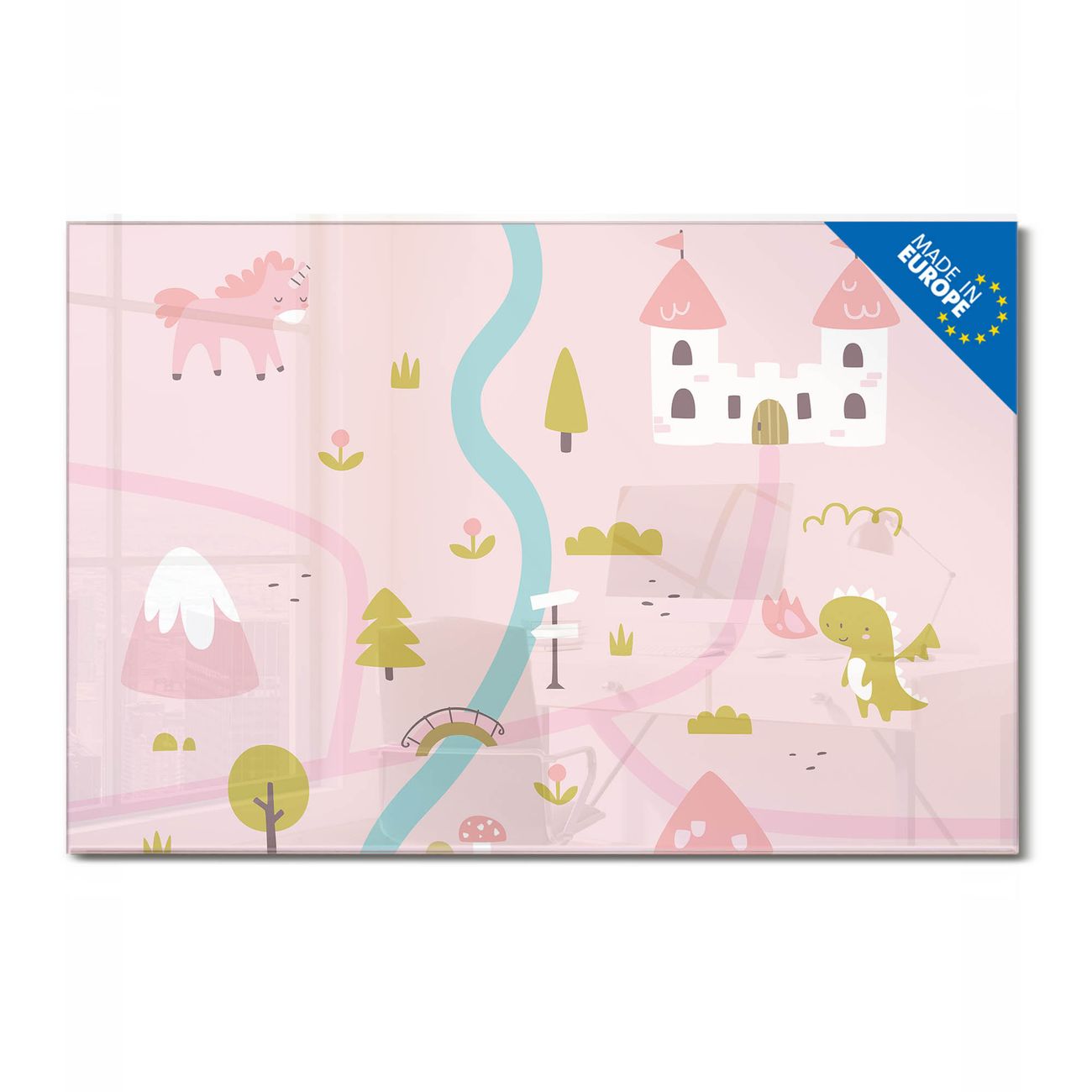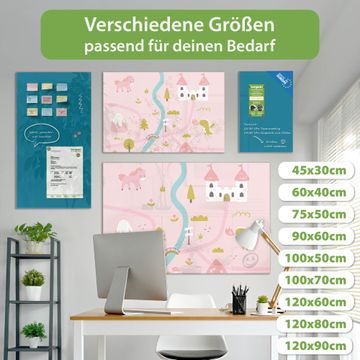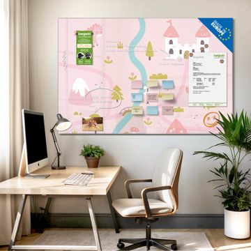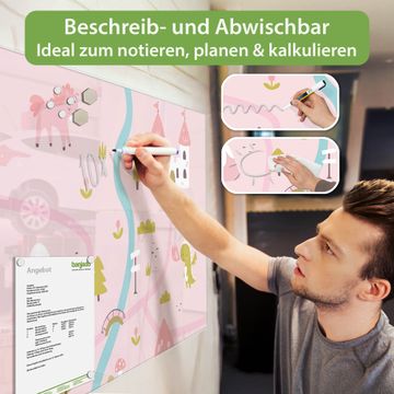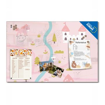 Material: 4mm Sicherheitsglas mit Metallrückwand Eigenschaften: beschreibbar, magnetisch, kratzfest Maße: 90x60x0,6cm, 8,10kg schwer Motiv Nummer 13016 Märchendorf 2 Zubehör: inklusive 4 Neodym-Magnete