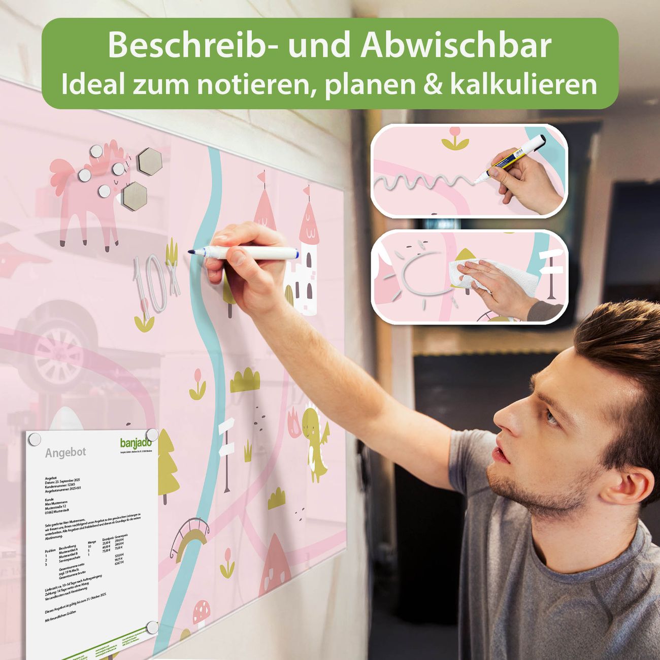 Jede Glas Magnettafel wird in unserer Werkstatt von Hand gefertigt und sorgfältig geprüft. So erhalten Sie ein echtes Qualitätsprodukt, das Funktion und Ästhetik perfekt vereint.?? Warum banjado?