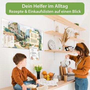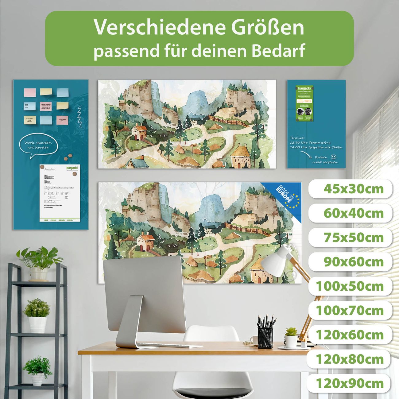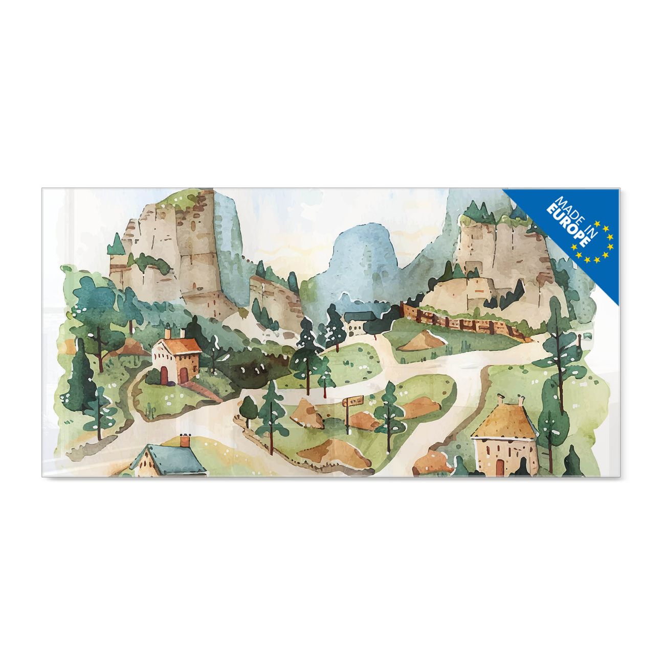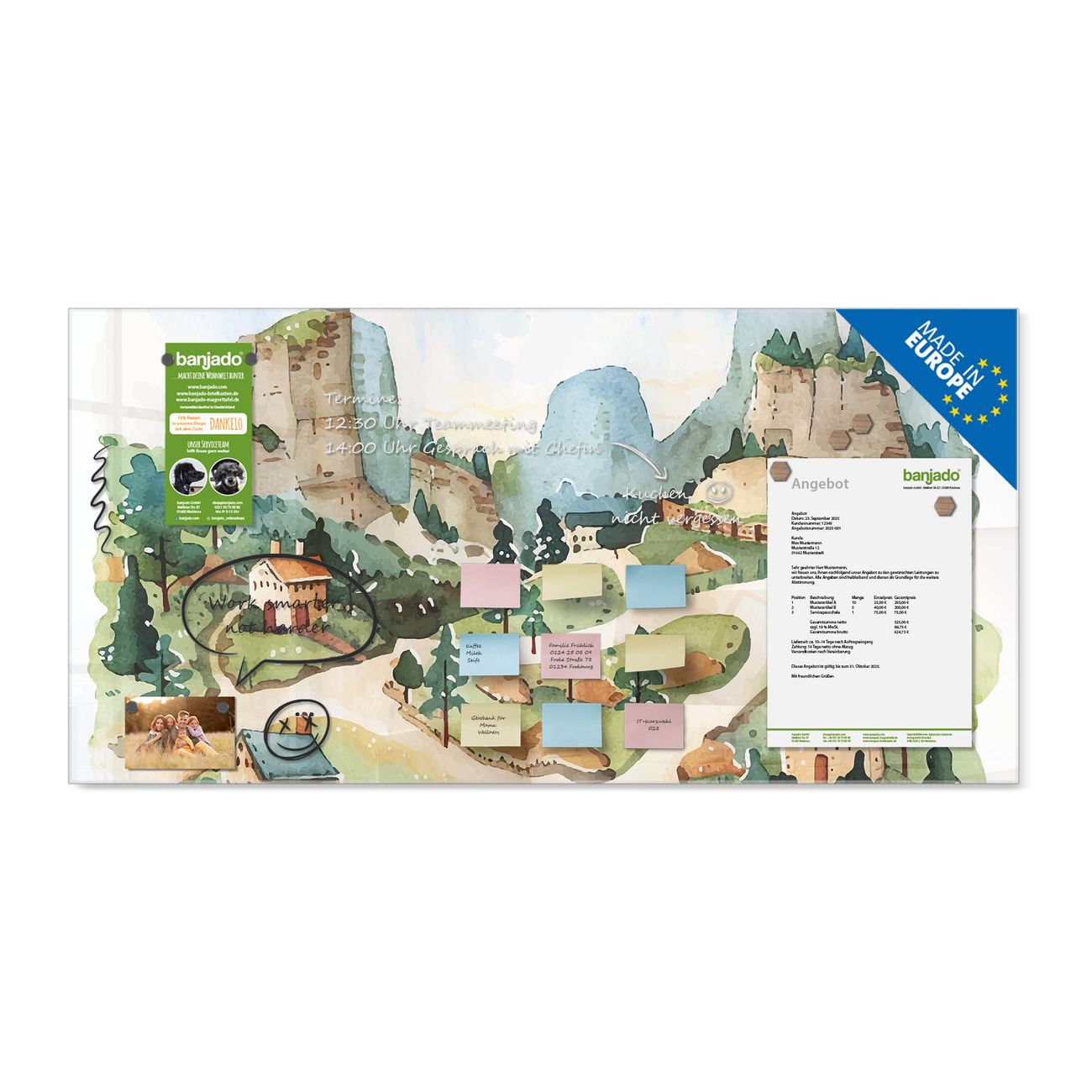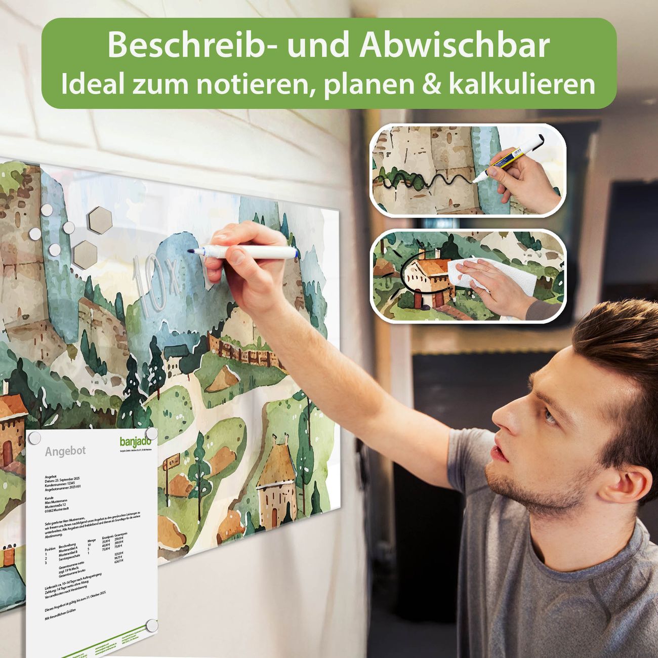 Material: 4mm Sicherheitsglas mit Metallrückwand Eigenschaften: beschreibbar, magnetisch, kratzfest Maße: 100x50x0,6cm, 7,50kg schwer Motiv Nummer 13017 Märchendorf 3 Zubehör: inklusive 4 Neodym-Magnete