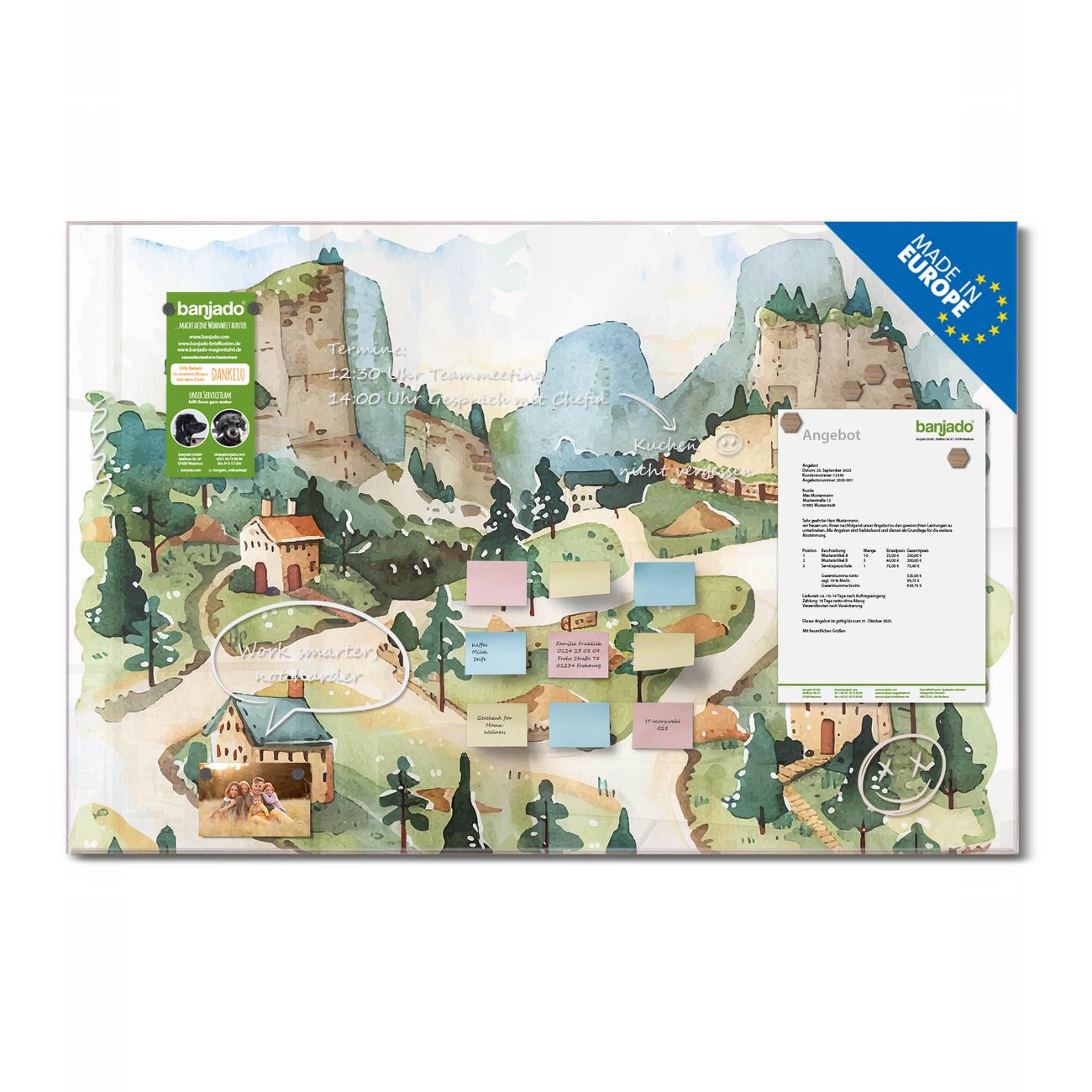 Material: 4mm Sicherheitsglas mit Metallrückwand Eigenschaften: beschreibbar, magnetisch, kratzfest Maße: 120x80x0,6cm, 14,40kg schwer Motiv Nummer 13017 Märchendorf 3 Zubehör: inklusive 4 Neodym-Magnete