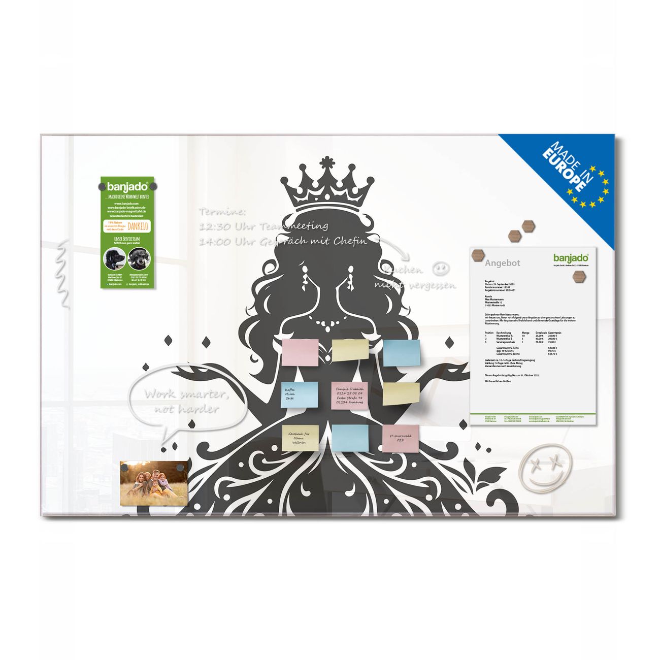 Material: 4mm Sicherheitsglas mit Metallrückwand Eigenschaften: beschreibbar, magnetisch, kratzfest Maße: 120x80x0,6cm, 14,40kg schwer Motiv Nummer 13251 Märchenprinzessin Zubehör: inklusive 4 Neodym-Magnete