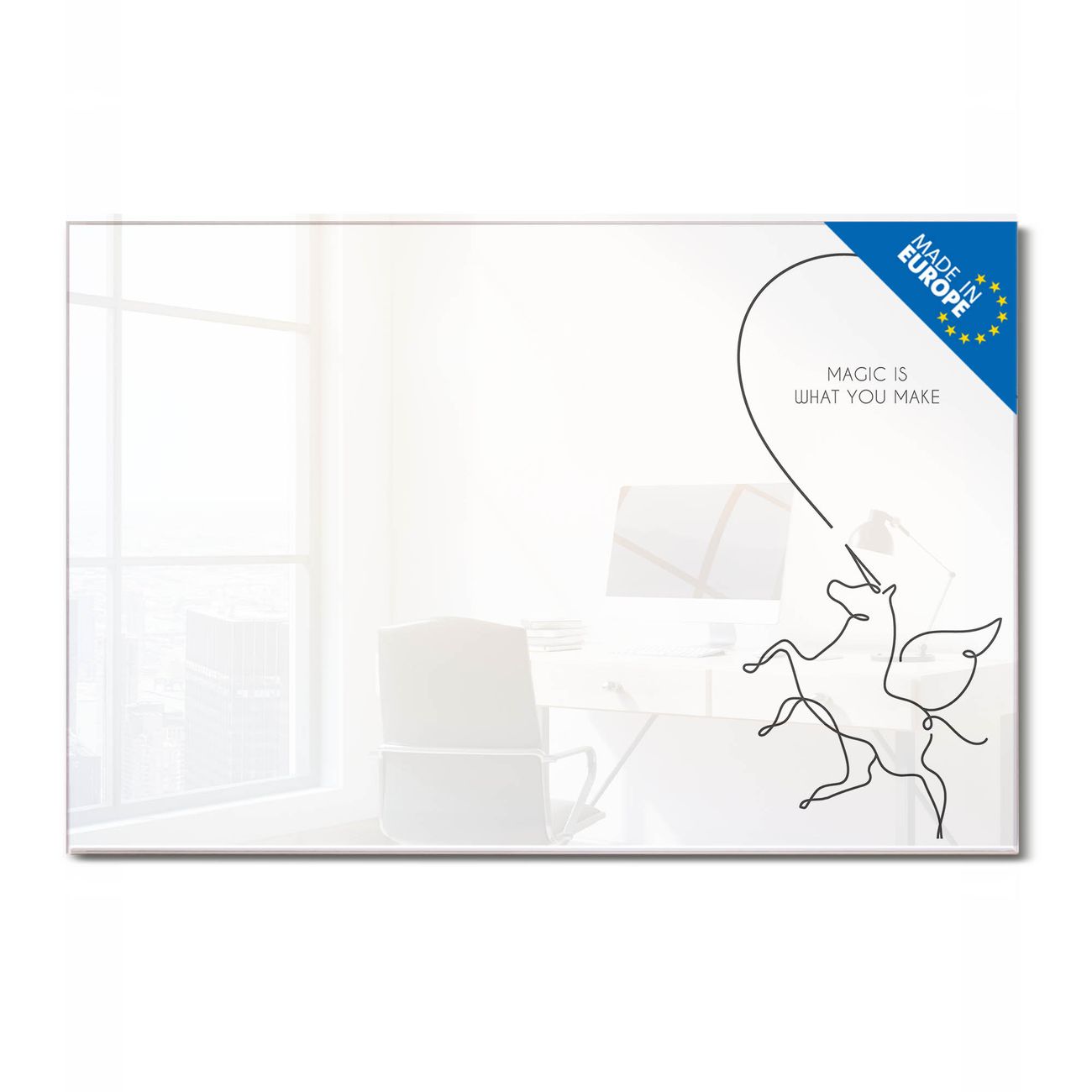 Material: 4mm Sicherheitsglas mit Metallrückwand Eigenschaften: beschreibbar, magnetisch, kratzfest Maße: 120x80x0,6cm, 14,40kg schwer Motiv Nummer 13501 Magisches Einhorn 2 Zubehör: inklusive 4 Neodym-Magnete
