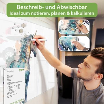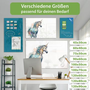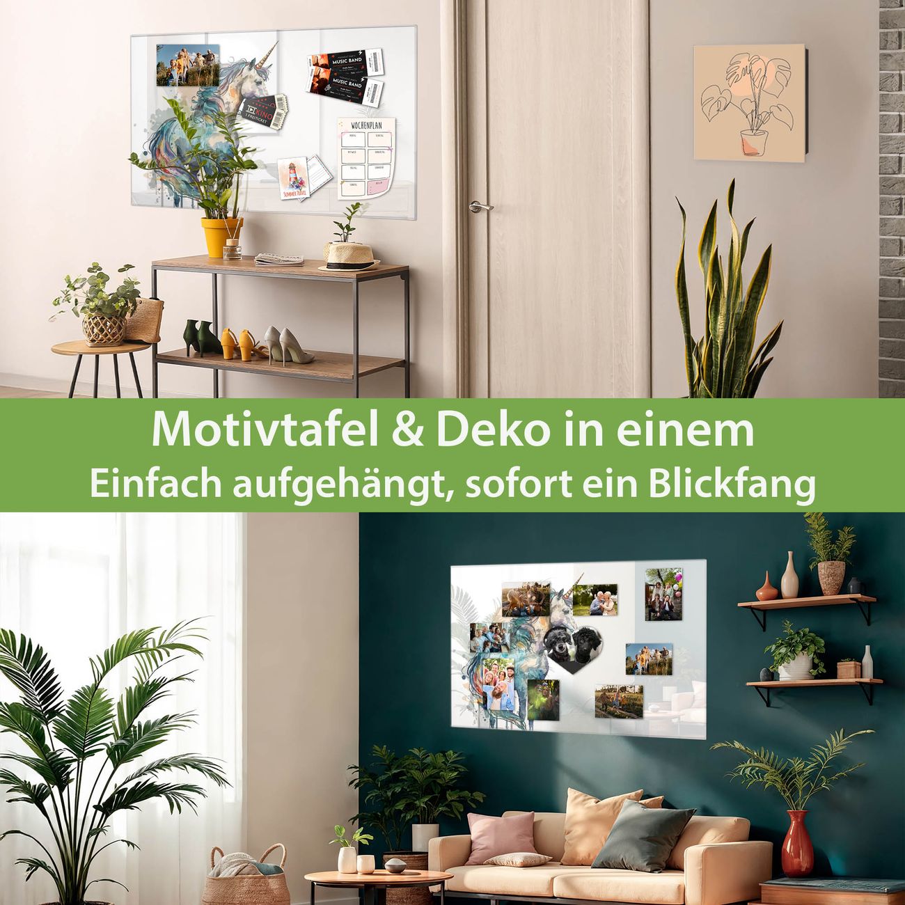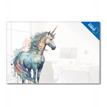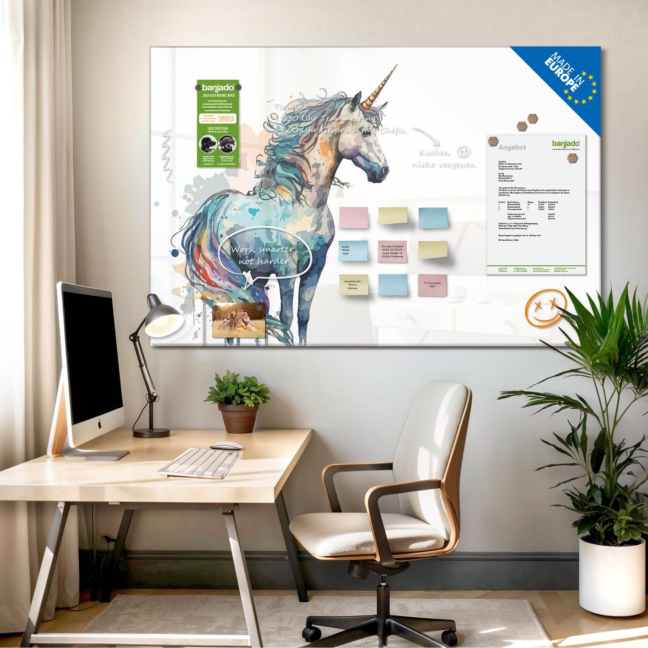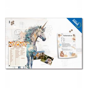 Material: 4mm Sicherheitsglas mit Metallrückwand Eigenschaften: beschreibbar, magnetisch, kratzfest Maße: 75x50x0,6cm, 5,63kg schwer Motiv Nummer 13465 Magisches Einhorn Zubehör: inklusive 4 Neodym-Magnete