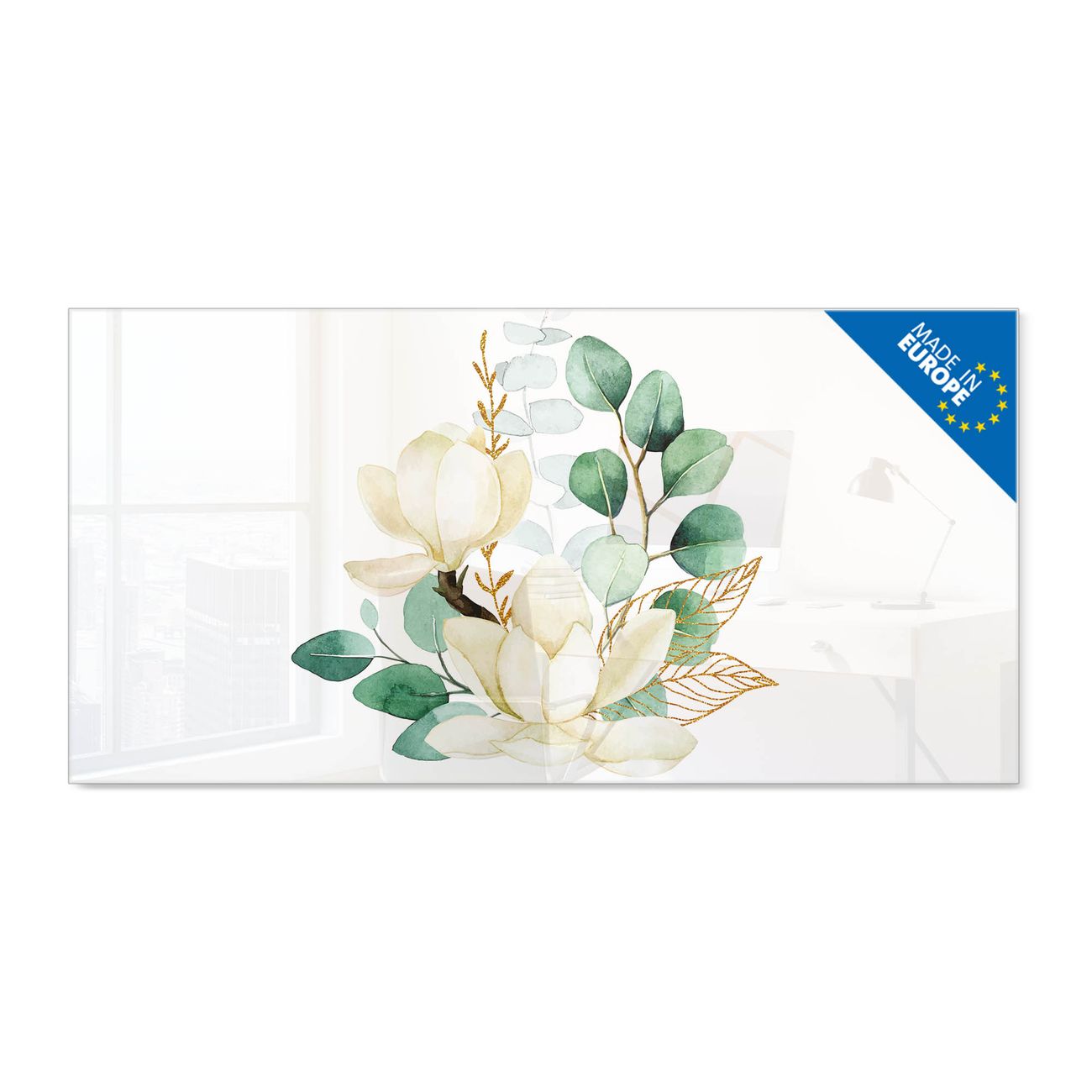 Material: 4mm Sicherheitsglas mit Metallrückwand Eigenschaften: beschreibbar, magnetisch, kratzfest Maße: 100x50x0,6cm, 7,50kg schwer Motiv Nummer 13231 Magnolienpoesie Zubehör: inklusive 4 Neodym-Magnete