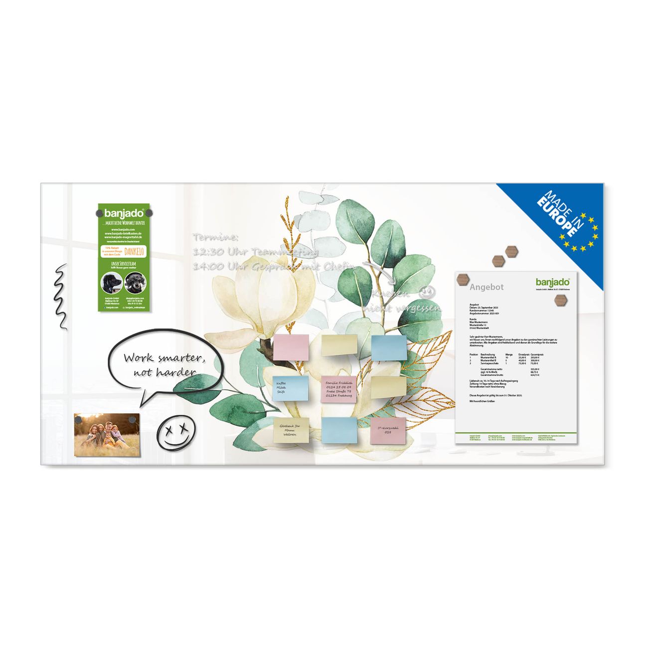 Jede Glas Magnettafel wird in unserer Werkstatt von Hand gefertigt und sorgfältig geprüft. So erhalten Sie ein echtes Qualitätsprodukt, das Funktion und Ästhetik perfekt vereint.?? Warum banjado?