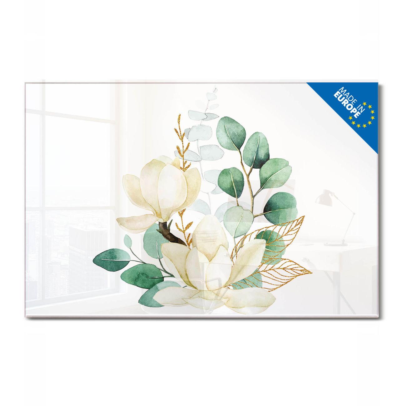 Material: 4mm Sicherheitsglas mit Metallrückwand Eigenschaften: beschreibbar, magnetisch, kratzfest Maße: 120x80x0,6cm, 14,40kg schwer Motiv Nummer 13231 Magnolienpoesie Zubehör: inklusive 4 Neodym-Magnete