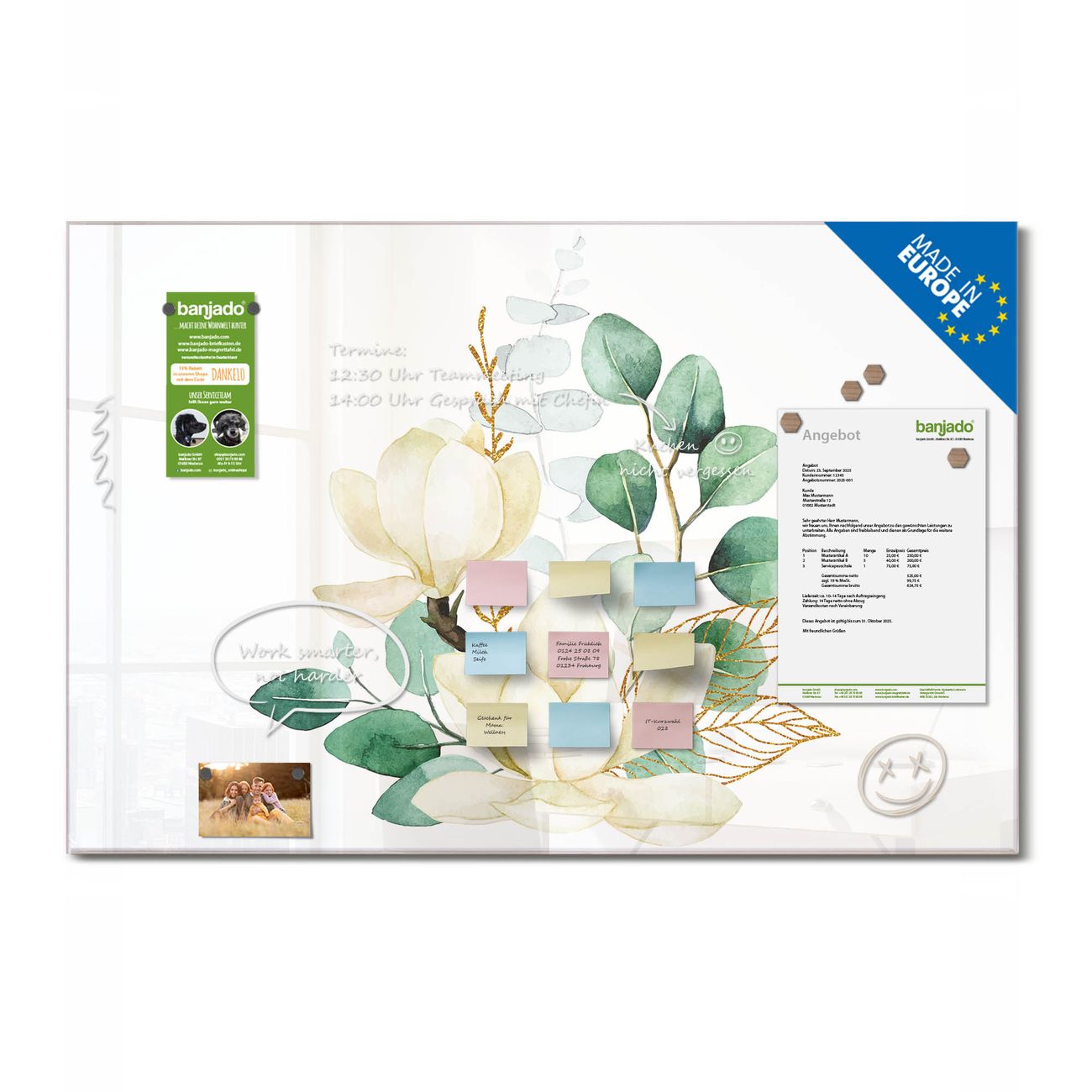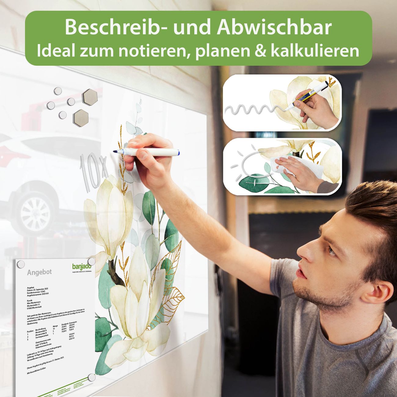 Die banjado Glas Magnettafel mit dem Motiv Motiv Magnolienpoesie verbindet Funktionalität mit Stil. Sie ersetzt das Zettelchaos durch klare Strukturen und bringt dabei eine warme, natürliche Atmosphäre in Ihr Zuhause. Ob im Büro, in der Küche oder im Eingangsbereich - dieses Design-Board zieht Blicke an und sorgt für Ordnung mit Charakter.