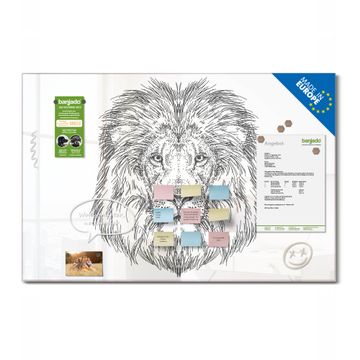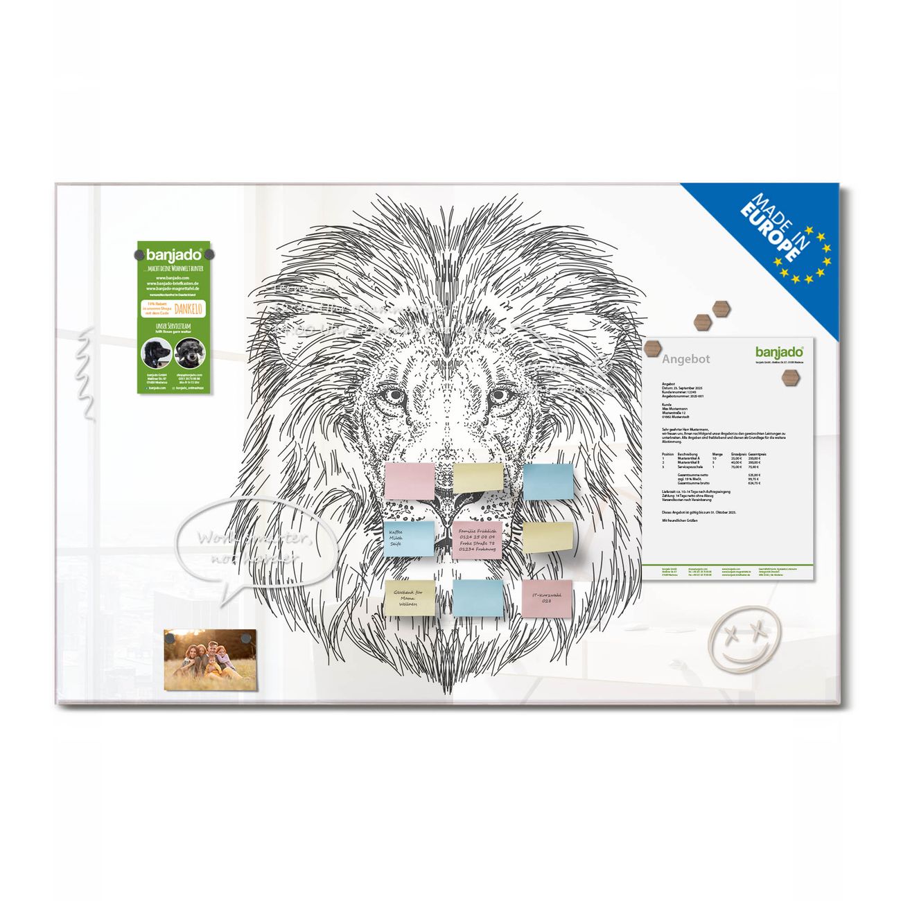 Material: 4mm Sicherheitsglas mit Metallrückwand Eigenschaften: beschreibbar, magnetisch, kratzfest Maße: 120x80x0,6cm, 14,40kg schwer Motiv Nummer 13489 Majestätischer Löwe Zubehör: inklusive 4 Neodym-Magnete