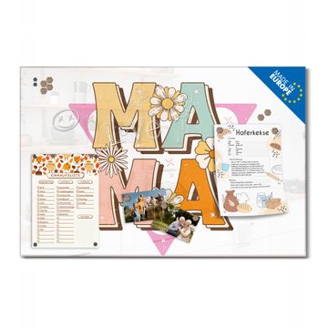 Material: 4mm Sicherheitsglas mit Metallrückwand Eigenschaften: beschreibbar, magnetisch, kratzfest Maße: 75x50x0,6cm, 5,63kg schwer Motiv Nummer 13361 Mama Liebe Retro Zubehör: inklusive 4 Neodym-Magnete