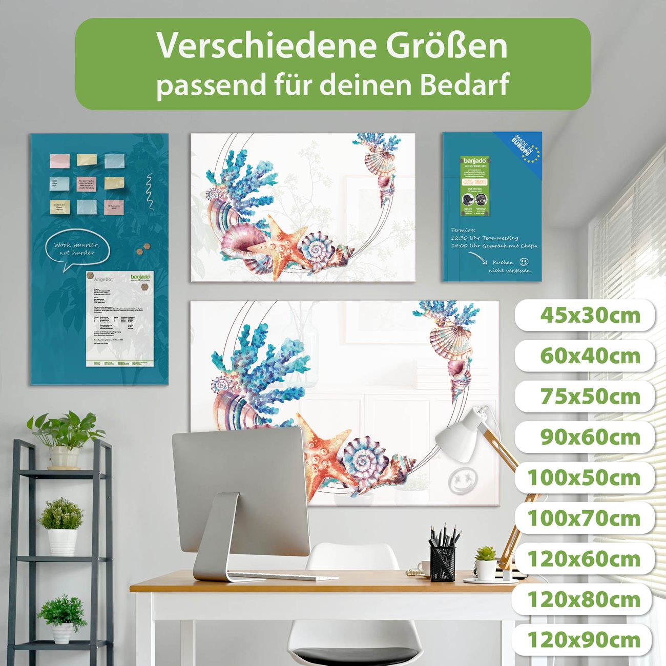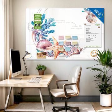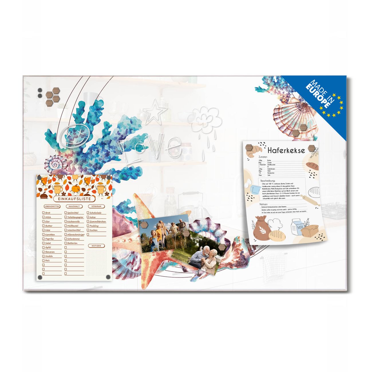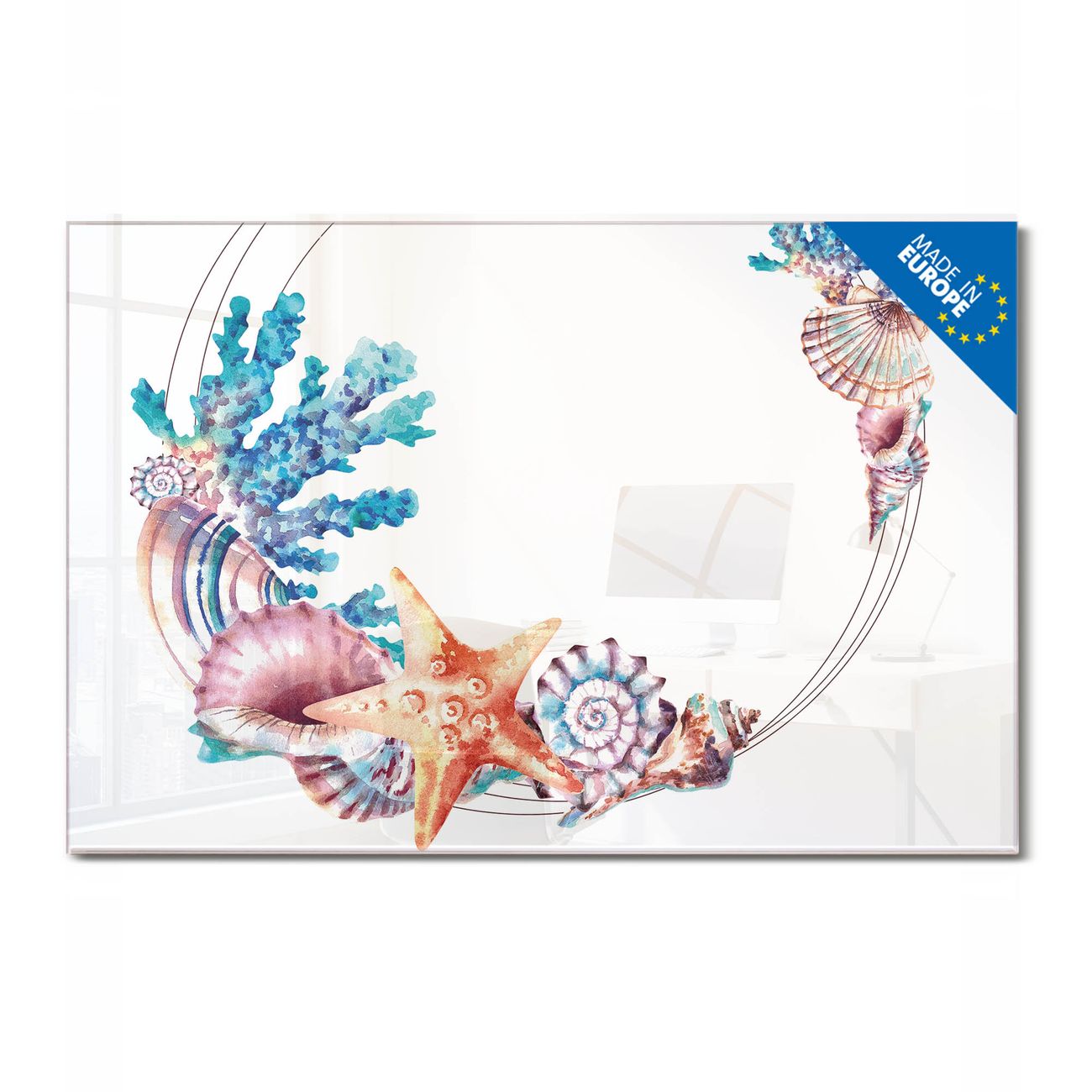 Material: 4mm Sicherheitsglas mit Metallrückwand Eigenschaften: beschreibbar, magnetisch, kratzfest Maße: 100x50x0,6cm, 7,50kg schwer Motiv Nummer 13569 Maritime Eleganz Zubehör: inklusive 4 Neodym-Magnete