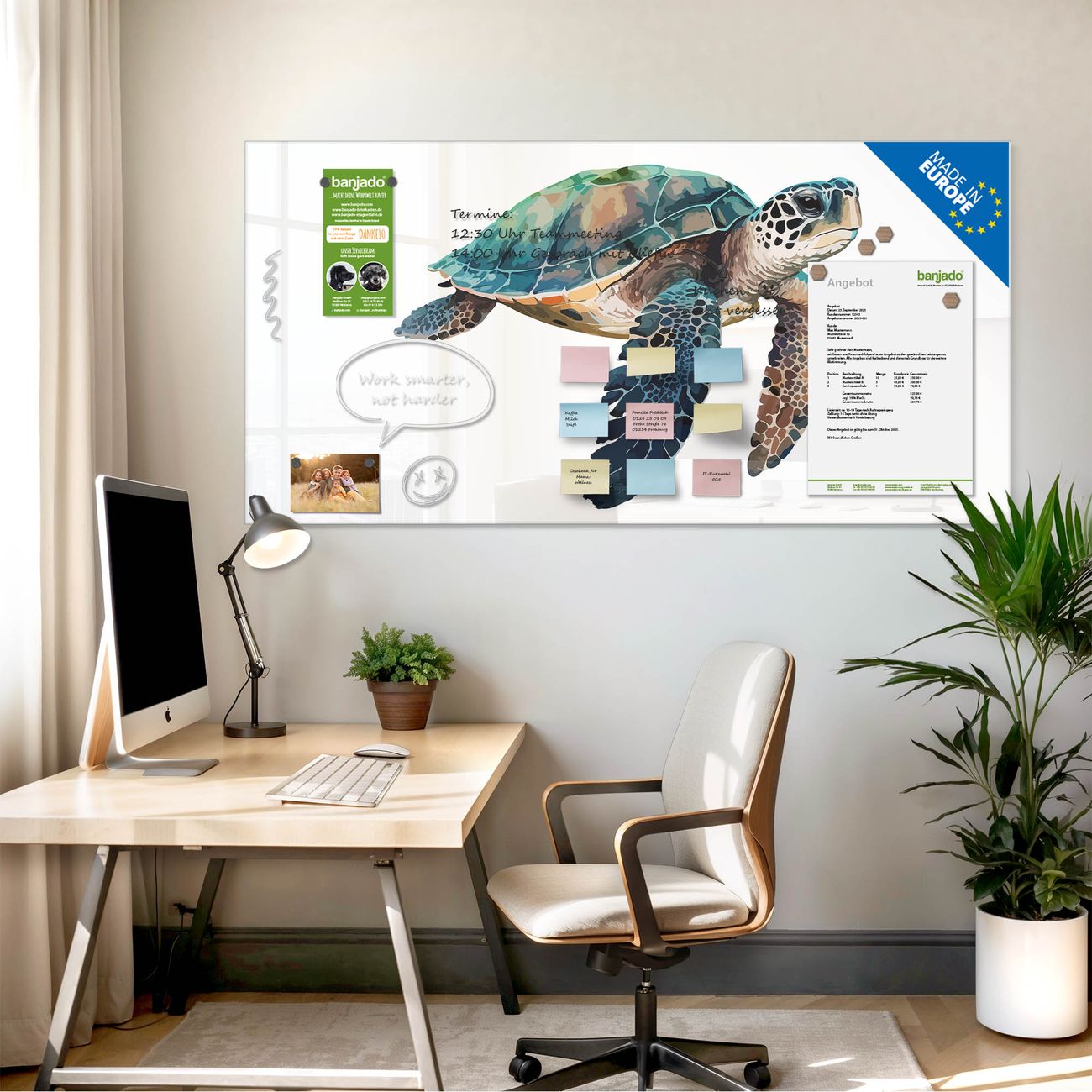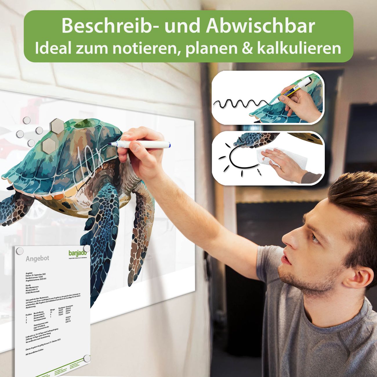 Material: 4mm Sicherheitsglas mit Metallrückwand Eigenschaften: beschreibbar, magnetisch, kratzfest Maße: 100x50x0,6cm, 7,50kg schwer Motiv Nummer 13458 Meeresschildkröte Abenteuer Zubehör: inklusive 4 Neodym-Magnete