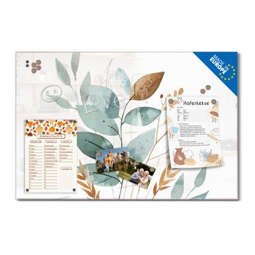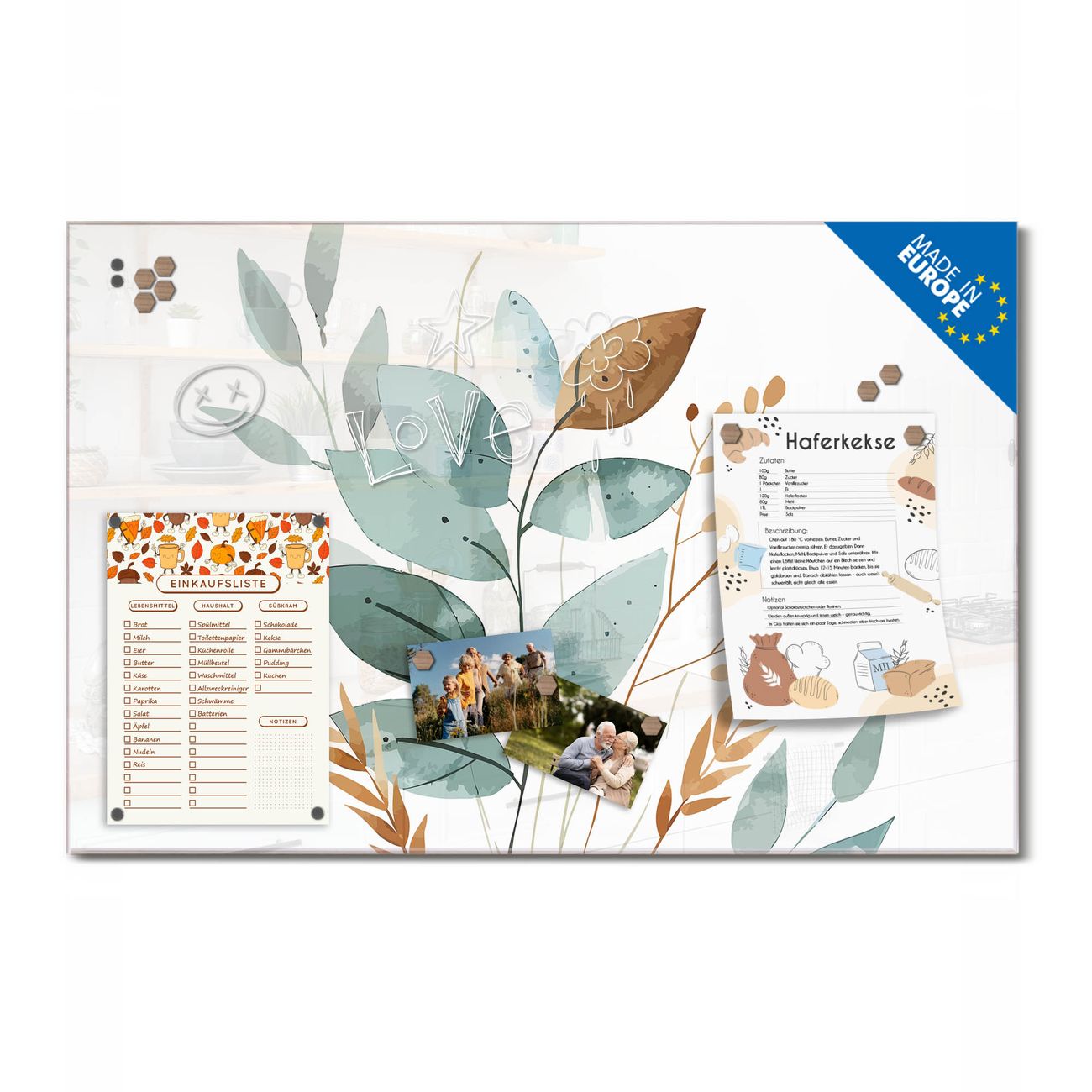 Material: 4mm Sicherheitsglas mit Metallrückwand Eigenschaften: beschreibbar, magnetisch, kratzfest Maße: 75x50x0,6cm, 5,63kg schwer Motiv Nummer 13224 Minimalistische Blätter Zubehör: inklusive 4 Neodym-Magnete
