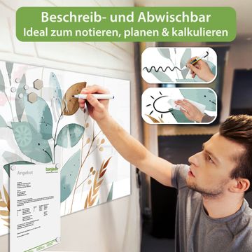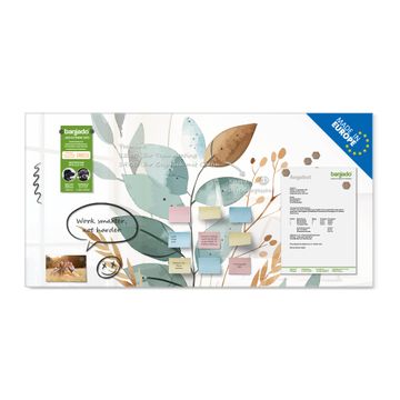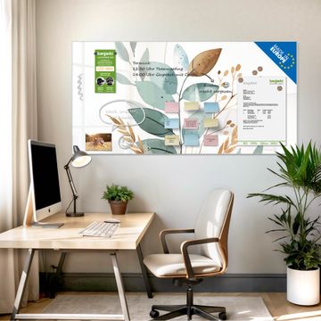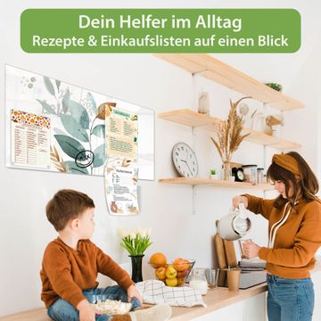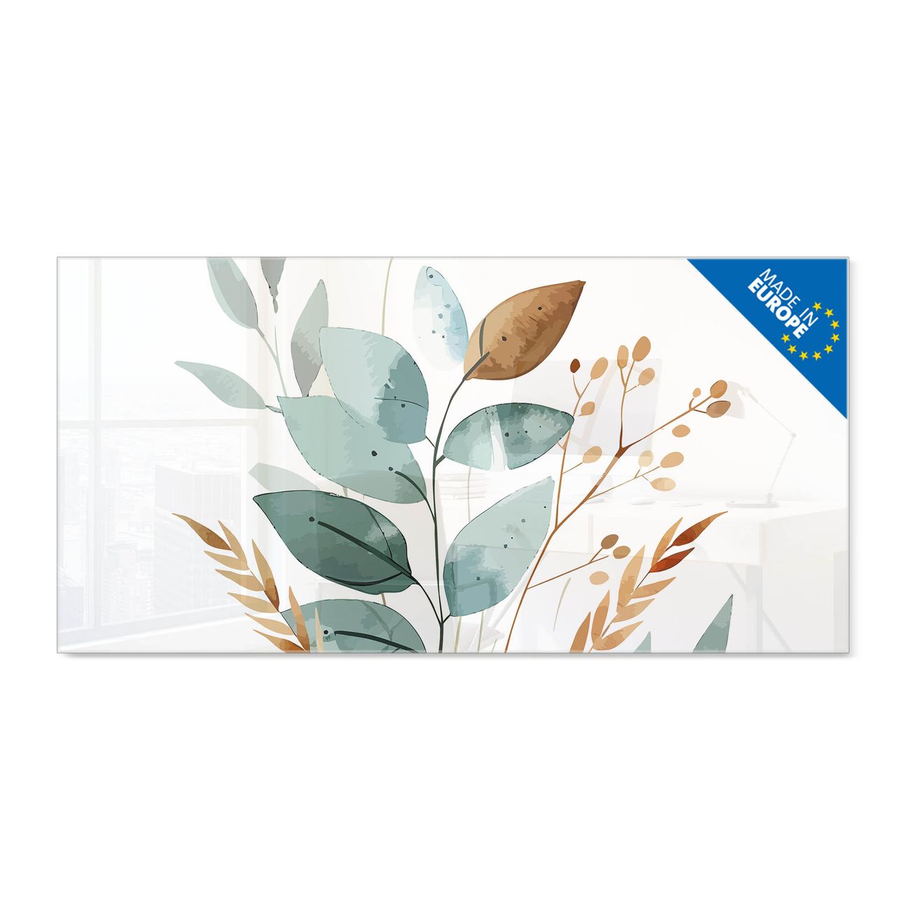 Material: 4mm Sicherheitsglas mit Metallrückwand Eigenschaften: beschreibbar, magnetisch, kratzfest Maße: 100x50x0,6cm, 7,50kg schwer Motiv Nummer 13224 Minimalistische Blätter Zubehör: inklusive 4 Neodym-Magnete