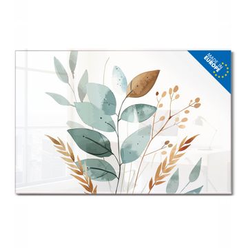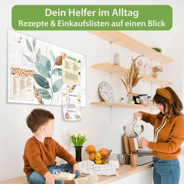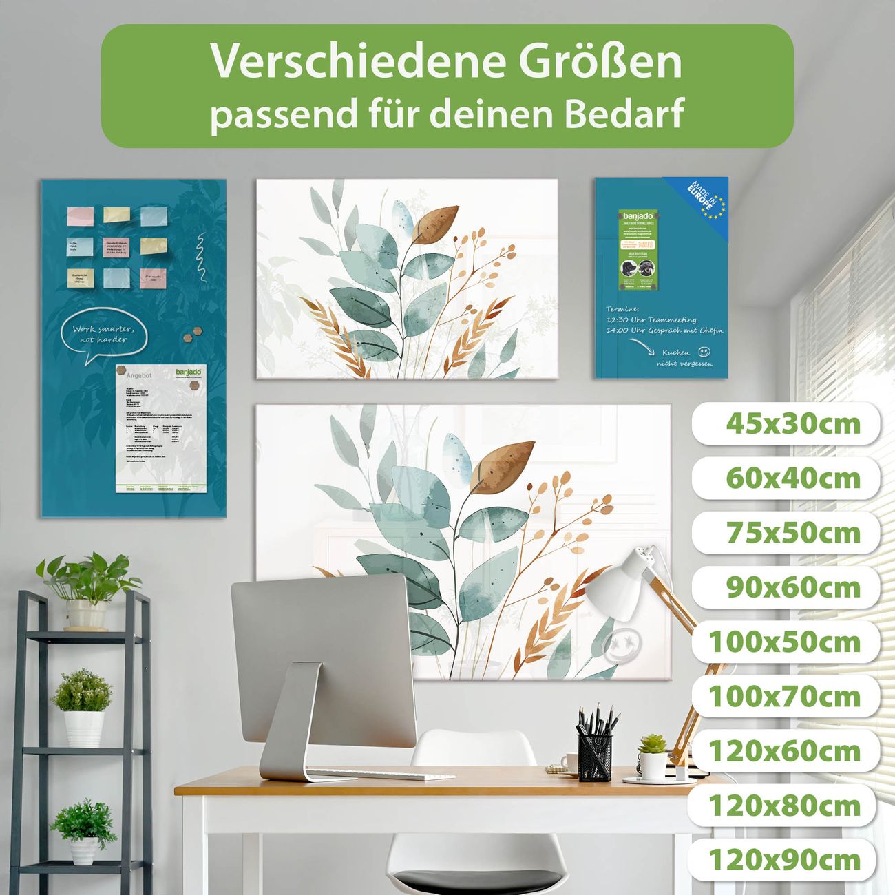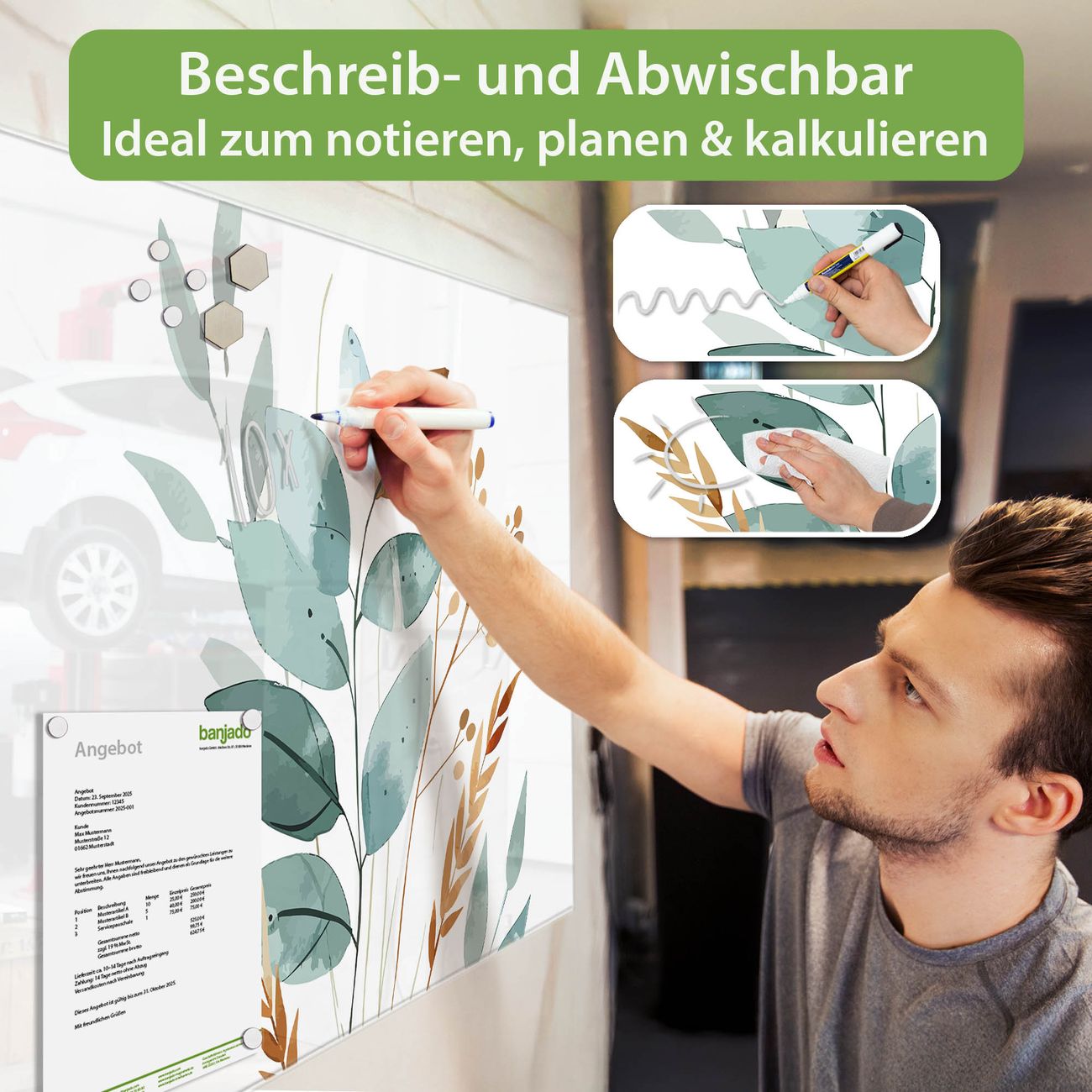 Material: 4mm Sicherheitsglas mit Metallrückwand Eigenschaften: beschreibbar, magnetisch, kratzfest Maße: 120x80x0,6cm, 14,40kg schwer Motiv Nummer 13224 Minimalistische Blätter Zubehör: inklusive 4 Neodym-Magnete